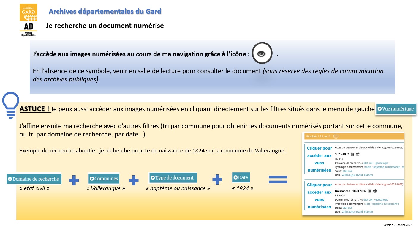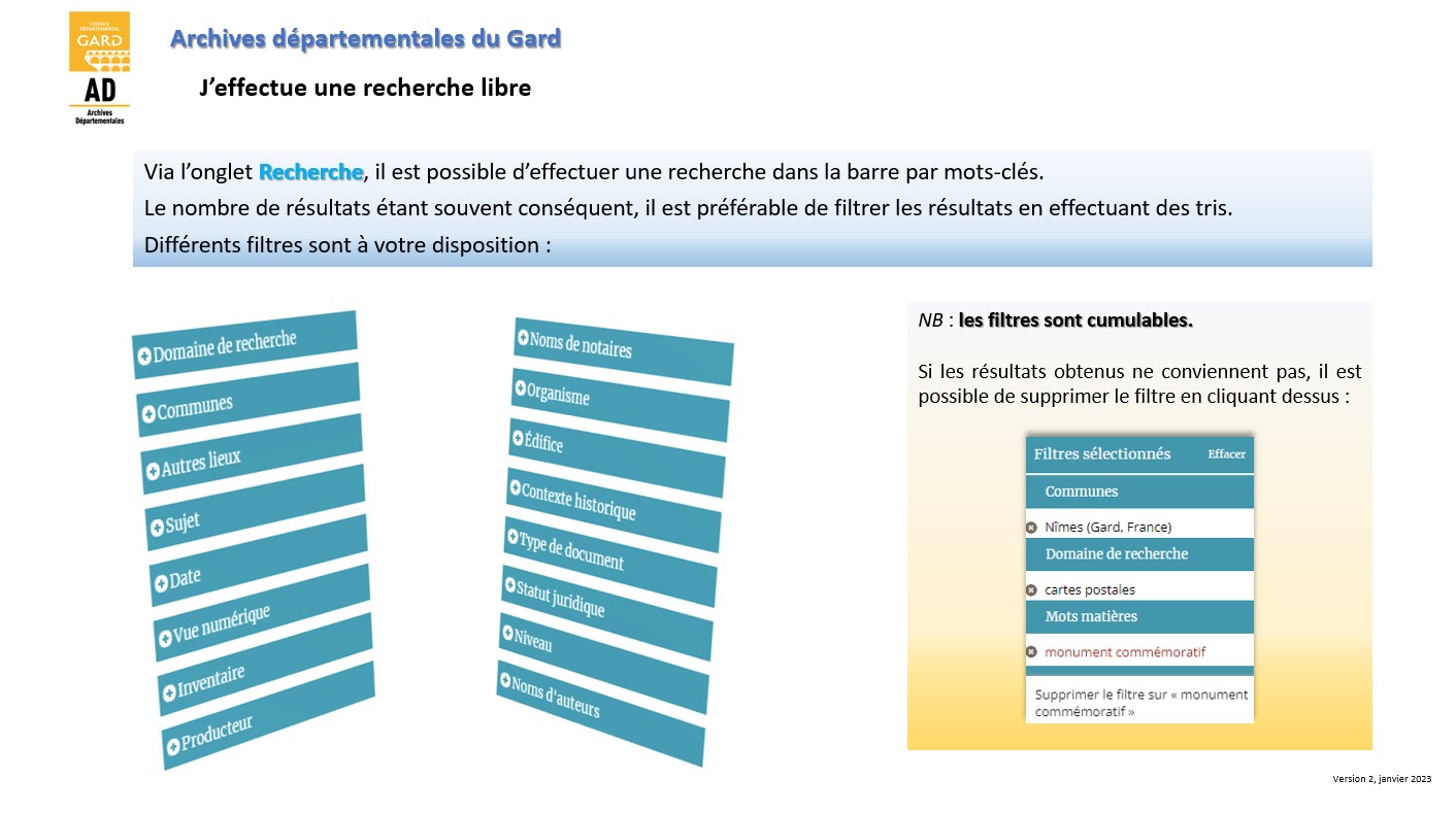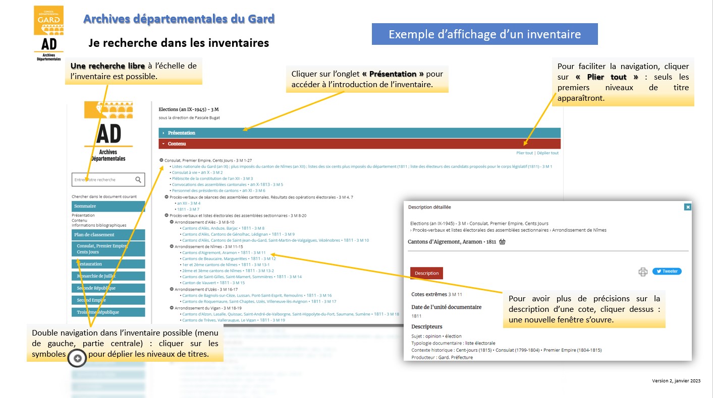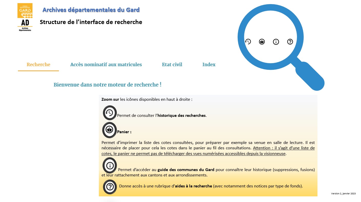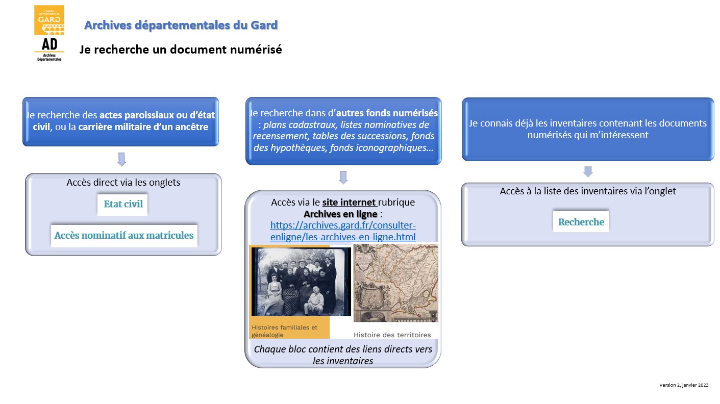 Il vous offre l’accès en ligne à une partie des inventaires conservés aux Archives départementales du Gard. Ceux dactylographiés ou imprimés (non informatisés pour le moment) sont consultables en salle de lecture