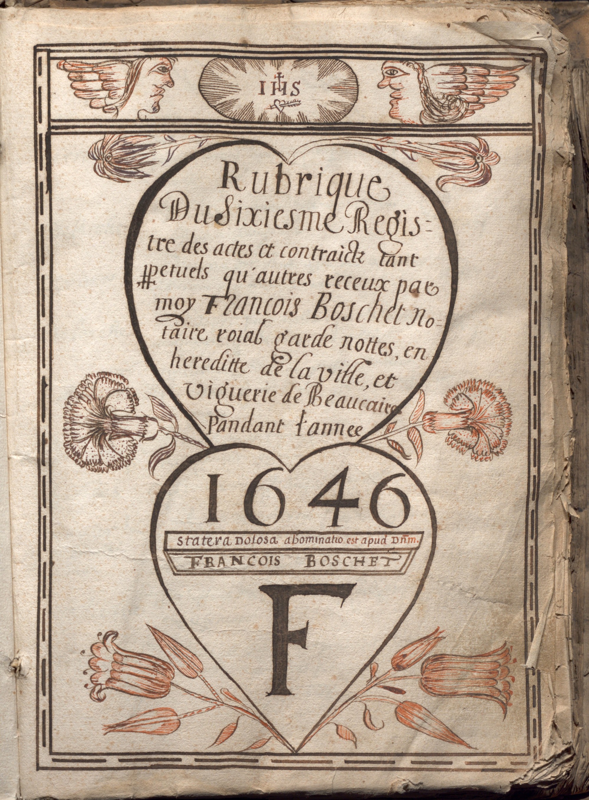 Page de titre calligraphiée et ornée de dessins, avec, pour devise attestant de l’honnêteté du notaire, un passage de la Bible (Livre des Proverbes, chapitre 11, verset 1) : « La balance trompeuse est en abomination devant le Seigneur. ». (Arch. dép. du Gard : 2 E 17 542).