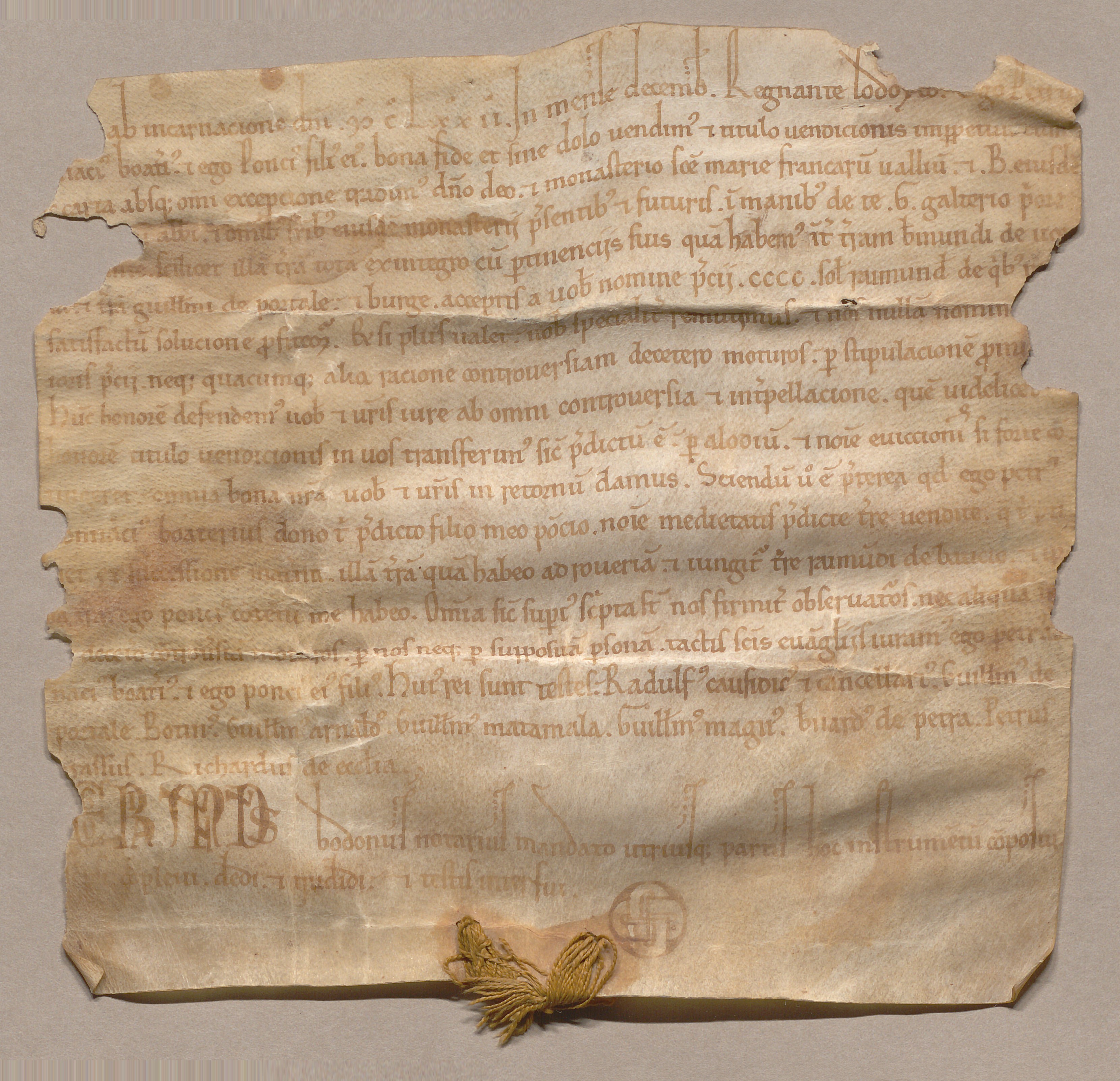 ⇒ Pierre Donat Boyer (Petrus Donacius Boaterius) et son fils Pons (Poncius) vendent à l'abbaye de Franquevaux une terre qu'ils ont entre celles de Bermond d'Uzès et de Guillaume de Portal, pour 400 sous raimondins, devant Raimond Boudon (Raimundus Bodonus) notaire. Décembre 1172. (Arch. dép. du Gard : H 38).