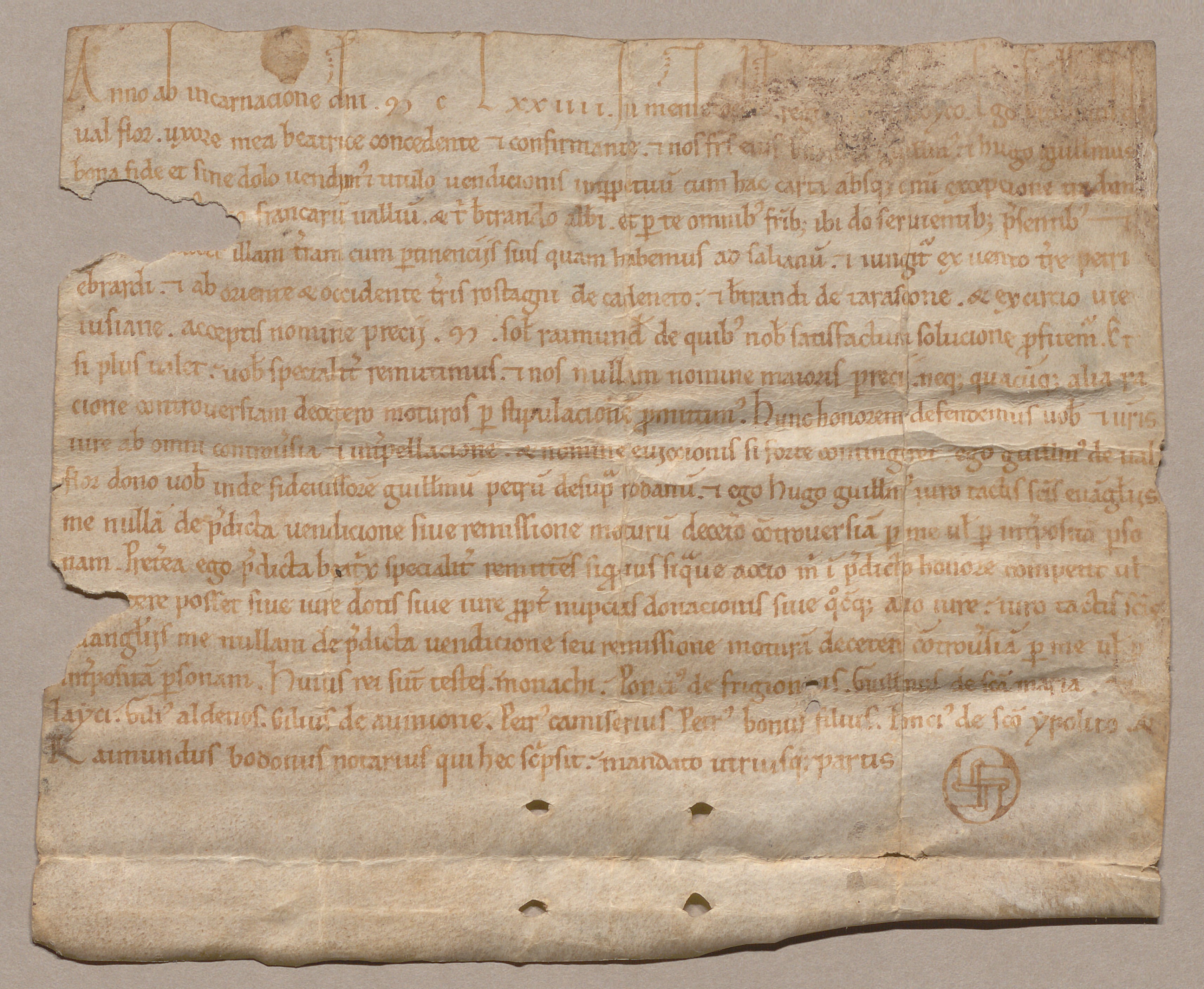 ⇒ Guillaume de Val Flor, sa femme Béatrix et leur fils Hugues Guillaume vendent à l'abbaye de Franquevaux une terre à Salian, pour 1000 sous raimondins, devant Raimond Boudon notaire. Octobre 1174. (Arch. dép. du Gard : H 38).