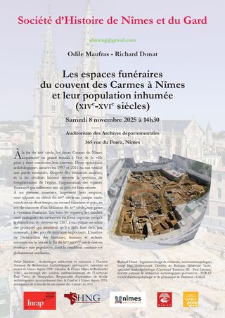 Conférence - "Les cimetières du couvent des Carmes de Nîmes (fin XIIIème siècle - milieu XVIème siècle)" par Odile Maufras et Richard Donat.