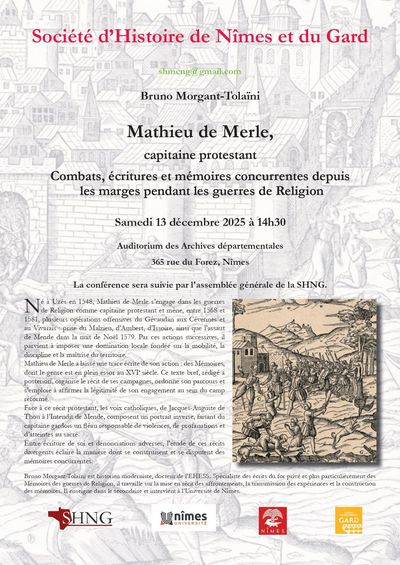 Conférence : "Mathieu de Merle, capitaine protestant : Combats, écritures et mémoire concurrentes depuis les marges pendant les guerres de Religion", par Bruno Morgant-Tolaïni.