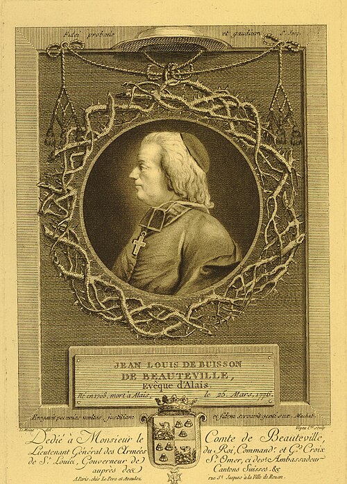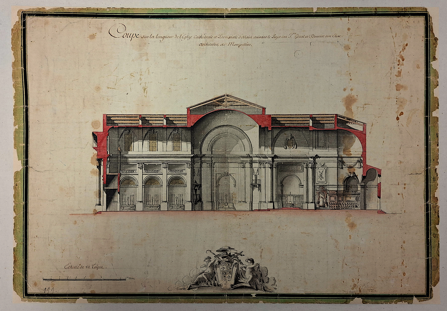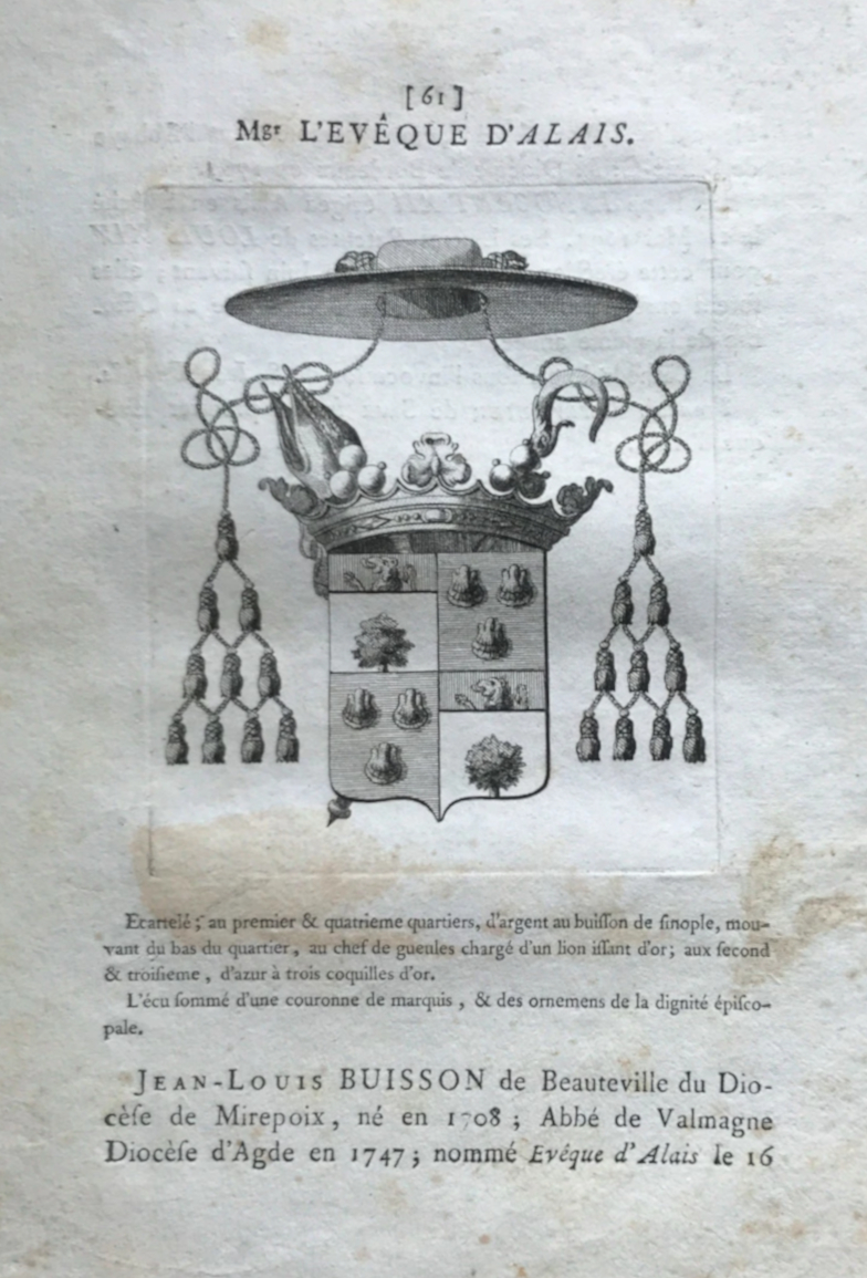 Élément essentiel du document, les armoiries de Buisson de Beauteville, adaptées à l'échelle du plan, constituent la véritable signature de cette commande, presque un acte officiel de patronage. Elles affirment à la fois l'autorité spirituelle et temporelle de l’évêque et reflètent les codes esthétiques de l’époque, à la croisée du rococo et du néoclassicisme.
