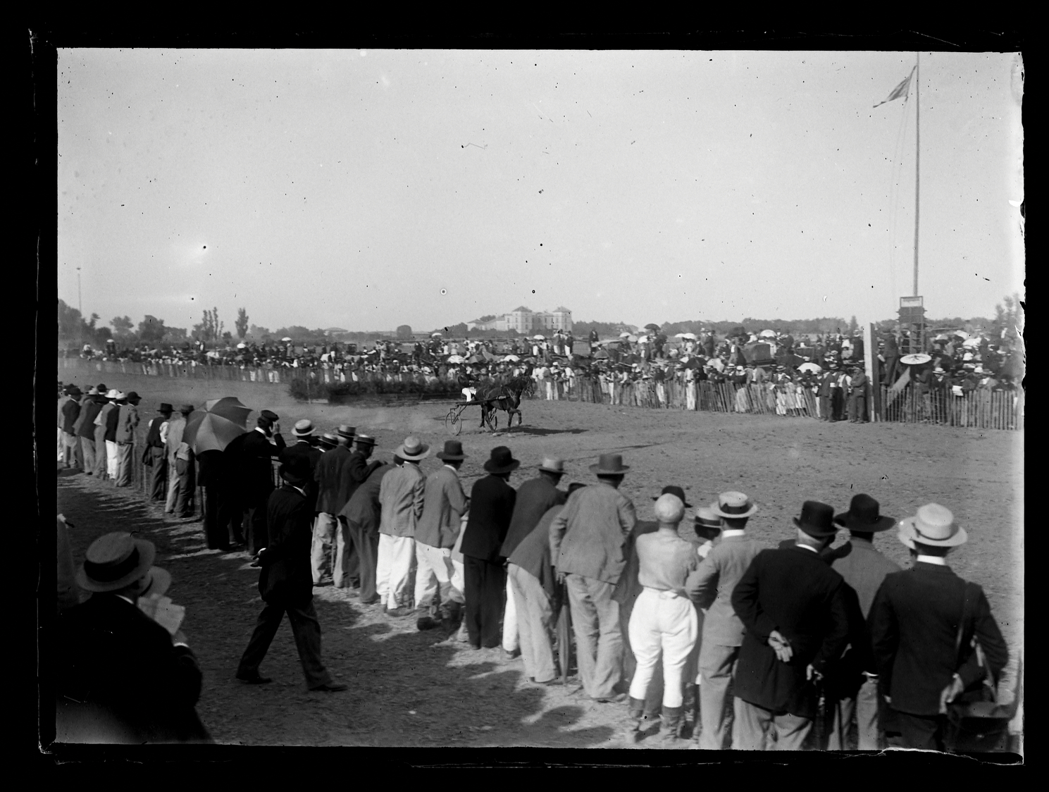 A une vie sociale déjà très active à cette époque, Vauvert propose ce nouveau loisir, souvent assorti de festivités, qui rassemble ici une foule nombreuse venue suivre les différents prix décernés. Même si ces installations restent rudimentaires, des gradins sont installés, tout comme des haies naturelles sur la large piste ; canotiers et ombrelles y ont bonne place et l’on remarque même un jockey au premier plan de la photographie. L’engouement est palpable. S’apprêtant à franchir la ligne d’arrivée on distingue le finish d’un trot attelé avec un driver solidement installé sur son sulky attelé au cheval. Brassard au bras sous un poteau portant une oriflamme, le juge de course se tient sur la ligne d’arrivée.