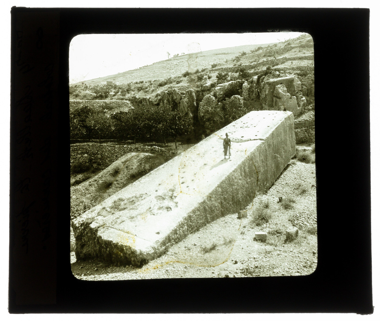 Nous sommes donc à Baalbek, l’ancienne Héliopolis, "La cité du soleil" à l’époque romaine, dans l’actuel Liban et la photographie date vraisemblablement du premier tiers du 20e siècle. Cette vue révèle les vestiges d’une plateforme mégalithique présentant parmi les plus importants blocs de pierre taillée extraits à ce jour, ces blocs massifs auraient été utilisés pour la construction du podium des temples romains et sont connus sous le nom de pierres du Trilithon. La pierre la plus colossale, mesure plus de 18 mètres de haut et malgré sa centralité le personnage qui s’y tient paraît bien minuscule et beaucoup de mystères entourent encore ces vénérables pierres.