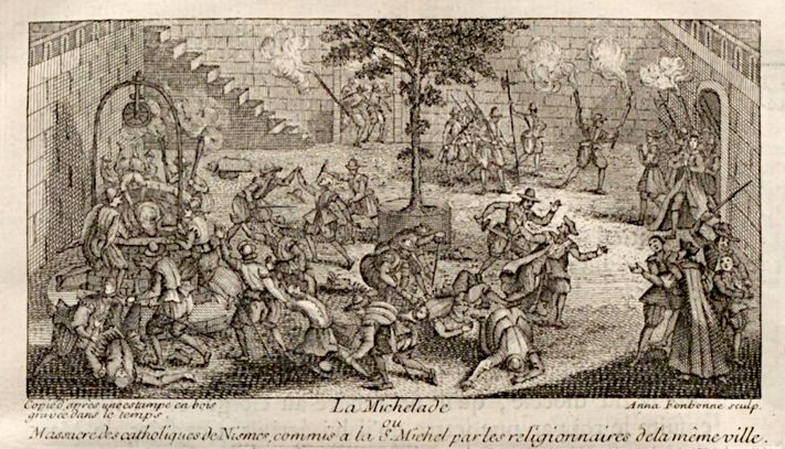 Entre le 29 et 30 septembre 1567 — l’histoire a retenu la date de la foire de la Saint-Michel, d’où le nom de "Michelade" — un épisode sanglant de violence confessionnelle éclate à Nîmes, en lien avec les guerres de Religion. Ce fut un événement exceptionnel car une majorité protestante attaqua une minorité catholique. Les émeutiers, animés de la ferme volonté de reprendre le consulat de la ville de Nîmes aux catholiques firent de nombreuses victimes, parmi lesquelles le premier consul Guy Rochette qui détenait les clés des portes de la ville. Cette scène est représentée en bas à droite de l’estampe, juste au-dessus de la signature ; d’autres scènes sont bien identifiées, notamment celle où l’on voit le capitaine Vidal se faire transpercer d’une lame au milieu de l’estampe, entre le puits et l’arbre.
