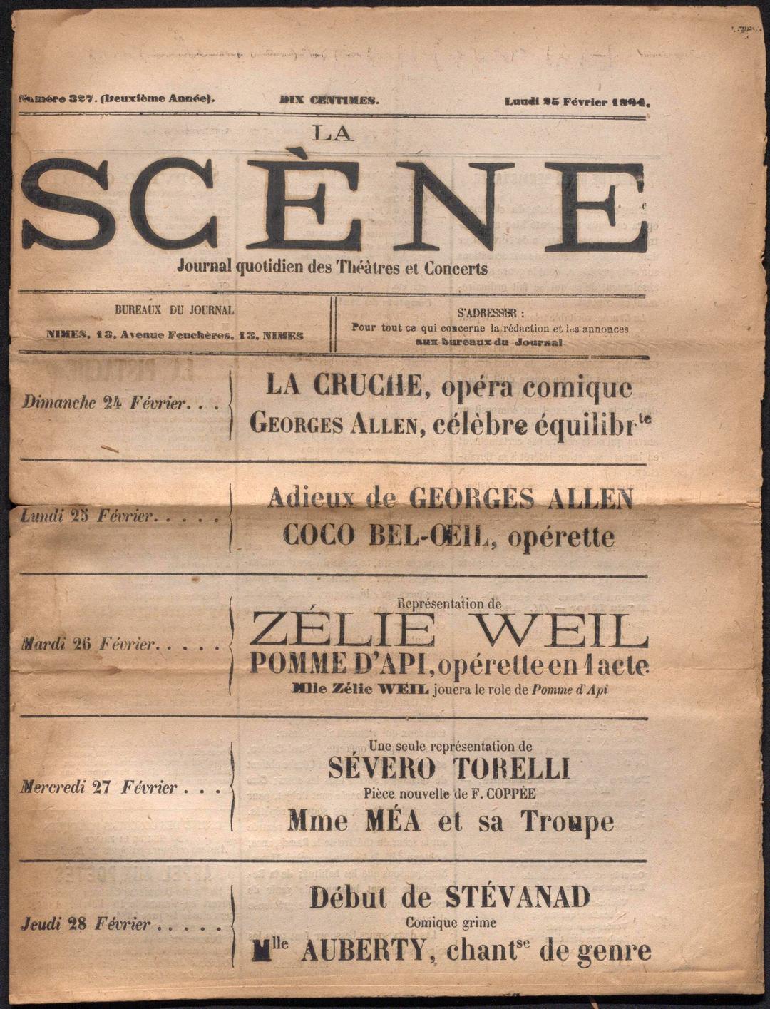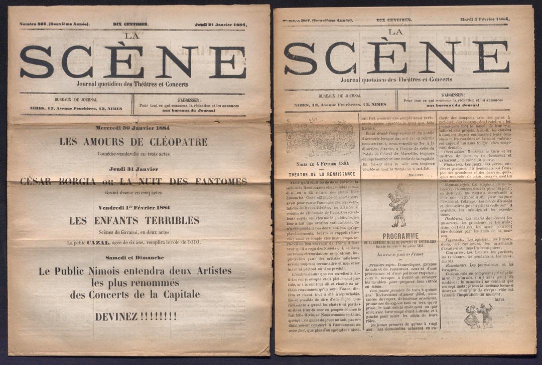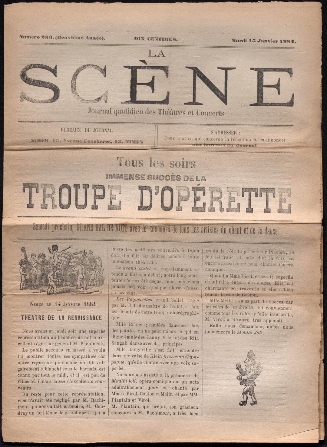 "La Scène", publiée de 1883 à 1890, était un journal quotidien des Théâtres et Concerts de Nîmes.