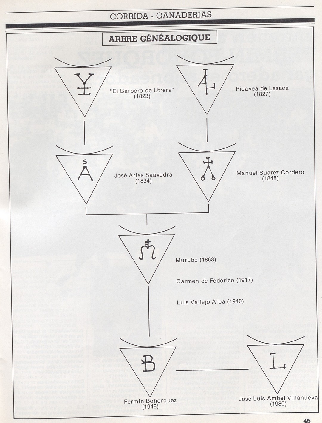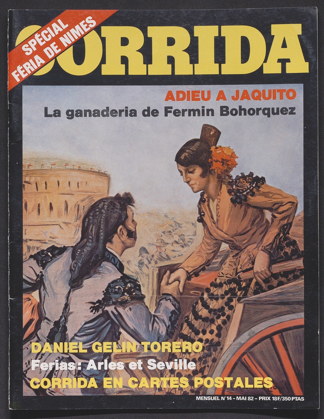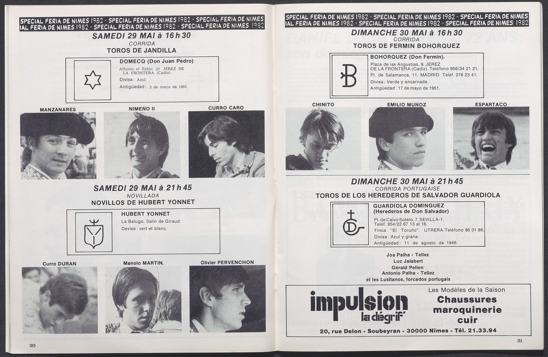 Attardons-nous sur le numéro spécial Féria de Nîmes paru en mai 1982. Ce qui attire l’œil dans un premier temps c’est sa première de couverture : une peinture originale qui donne le ton du milieu taurin et festif du journal. Ensuite si nous décidons de le feuilleter nous pouvons découvrir un contenu d’aficionados. Des photographies des toreros stars de cette décennie (en portrait ou en action dans les arènes). Des articles sur des corridas qui ont fait sensation de Séville à Arles en passant par Nîmes. Et plus surprenant un arbre généalogique d’élevage de taureaux (toros) de combat."