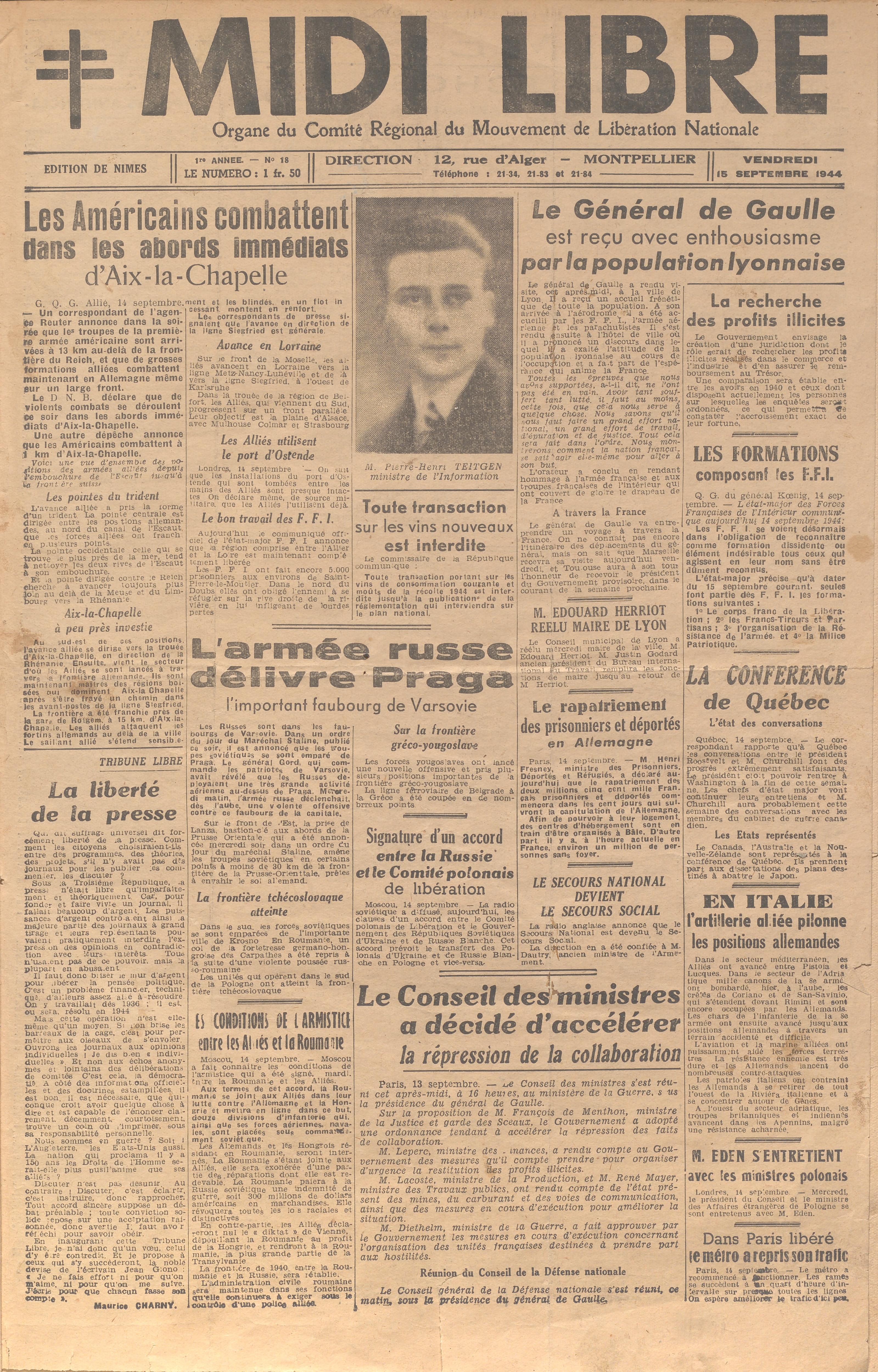 En ce mois du souvenir, quoi de mieux que de mettre en avant le 1er numéro de l’édition du Midi Libre de Nîmes, conservé aux Archives départementales du Gard.