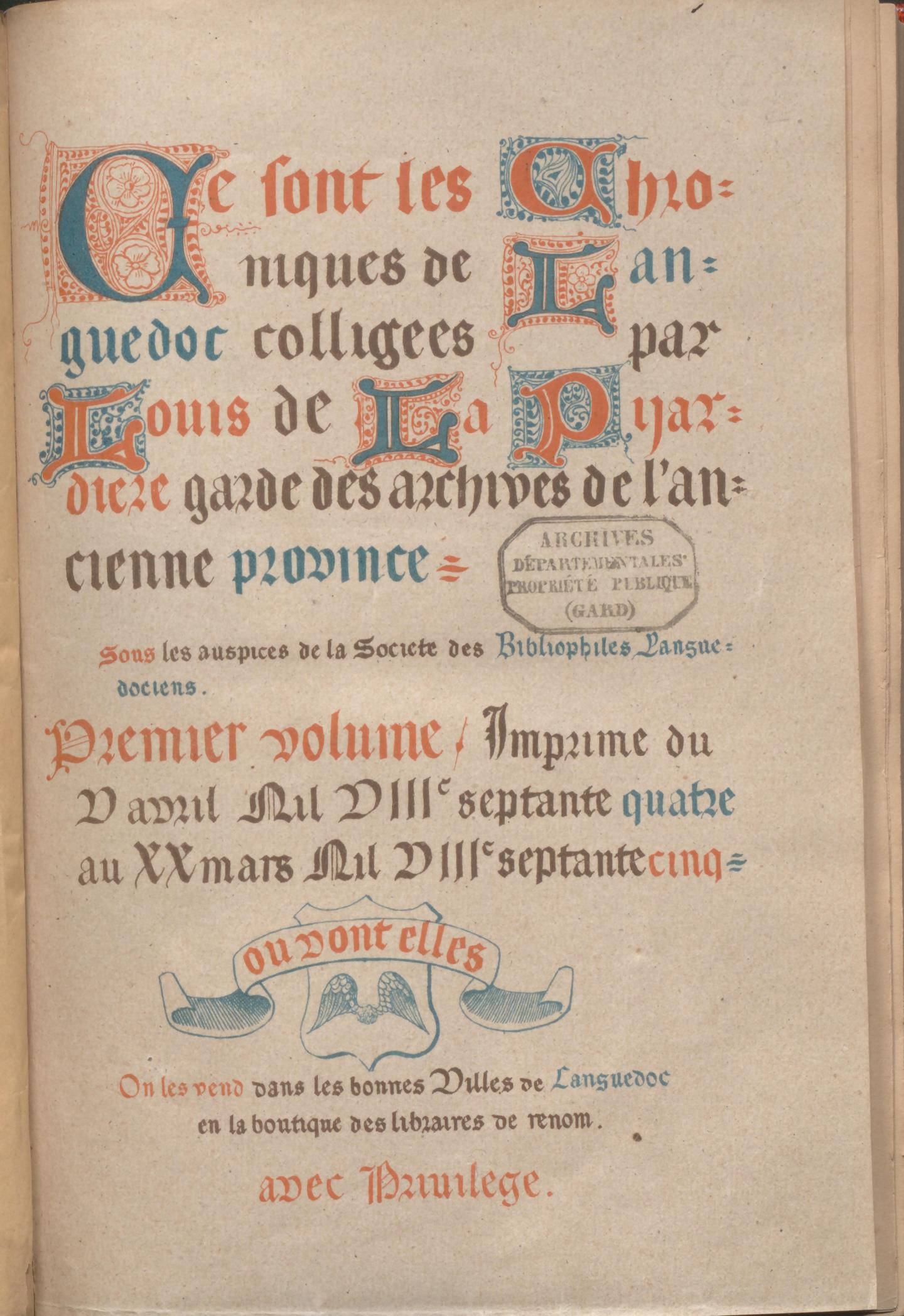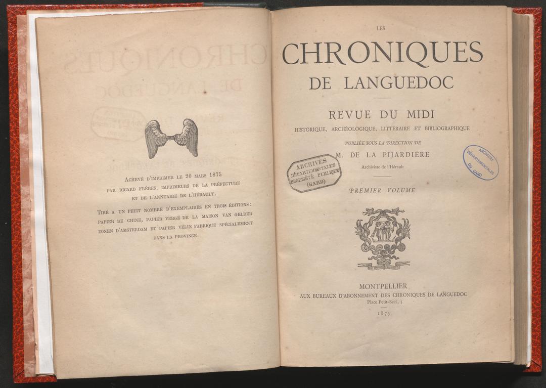 "Les Chroniques de Languedoc" étaient publiées à Montpellier par les frères Ricard entre 1874 et 1879, sous la direction de Louis Lacour de La Pijardière et avec la participation de la Société des bibliophiles languedociens.