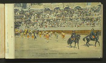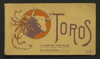 ► Sur le thème de la tauromachie, un carnet de cartes postales colorisées et détachables (70 Fi), présente une quinzaine de vues de courses de taureaux du début du XXe siècle.