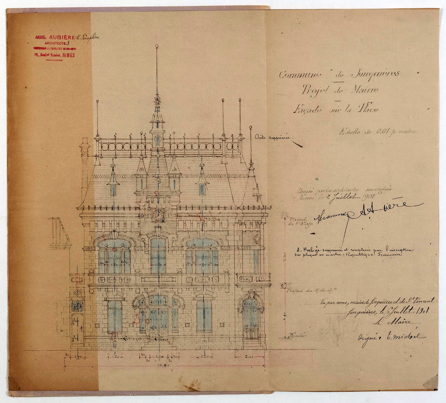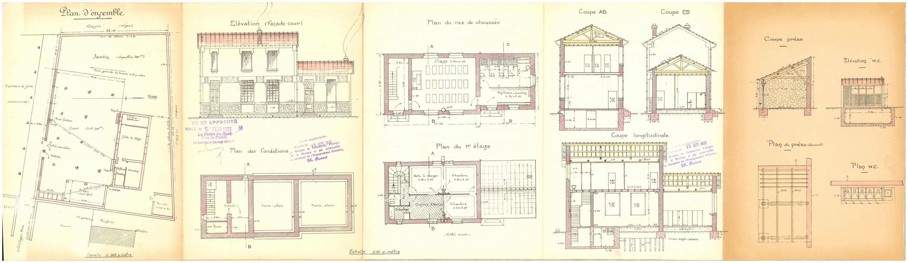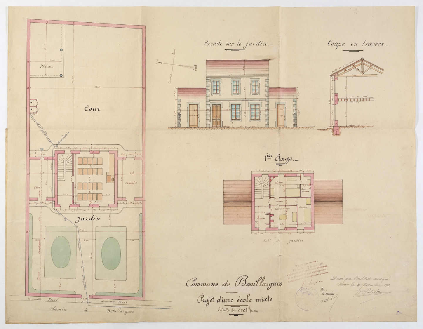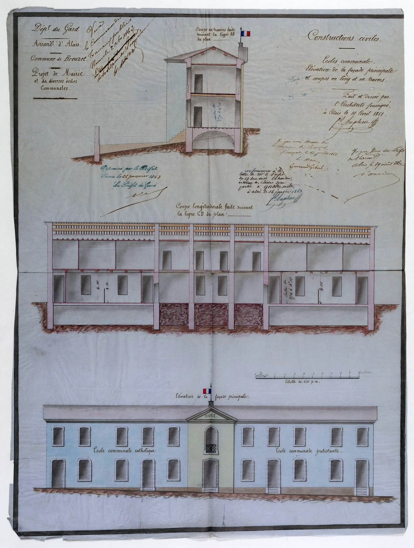 - mairie et écoles ["Mairie-école" ou "mairie-écoles" pour les très nombreuses communes rurales qui ont été édifié ou approprié, comme on le sait, des immeubles destinés à héberger à la fois la maison commune et les établissements d'enseignement. L'examen des dossiers de la sous-série 2 O montre que, dans le Gard, ce mouvement à commencer à prendre une ampleur certaine à la suite de la loi Guizot sur l'enseignement primaire (1833) et surtout à la fin de la Monarchie de Juillet (années 1844-1848)] ;