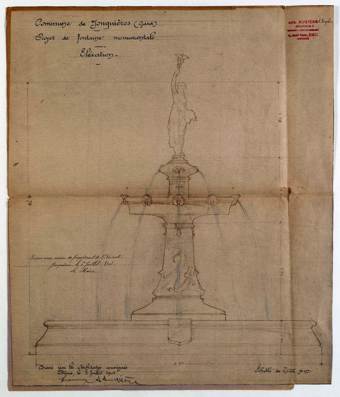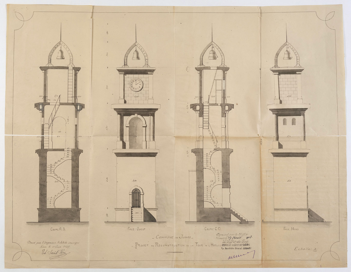 - En 1883, nous voyons les édiles de Vauvert faire construire sur la promenade du Jeu de Ballon, devant l'église, un bâtiment de deux pièces, dont l'une doit héberger les pompes à incendie et dont l'autre permettra de loger les taureaux à l'époque des courses : le devis nous précise que l'édifice sera couvert en terrasse avec garde-corps afin de servir d'estrade à la municipalité pendant les courses [2 O 2080. Vauvert est une des localités du Gard dont la tradition tauromachique est la plus ancienne et la plus brillante].