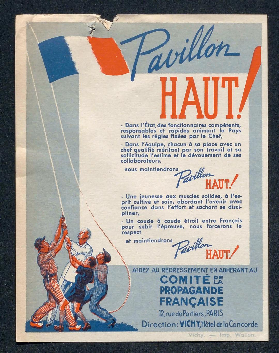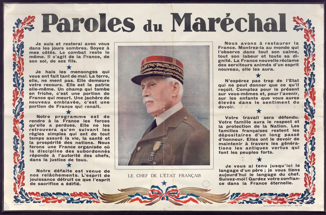 La défaite militaire française et la signature de l’armistice le 22 juin 1940 qui s’ensuit ont des conséquences immédiates pour les Français : division en deux parties du territoire (au nord, une zone occupée par les Allemands, au sud une zone placée sous l’autorité du maréchal Pétain). Le nouveau régime qui s’installe à Vichy est autoritaire, centré autour de la personne de Pétain qualifié de chef de "l’État français", et collaborationniste. Sa devise "Travail, Famille, Patrie" résume bien sa nature traditionaliste à laquelle s’ajoutent la xénophobie et l’antisémitisme.