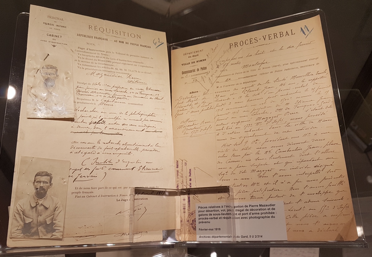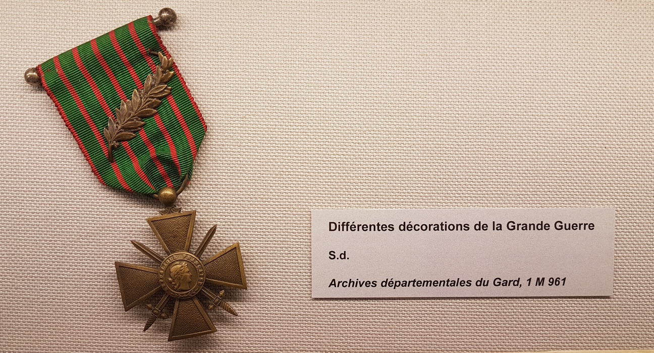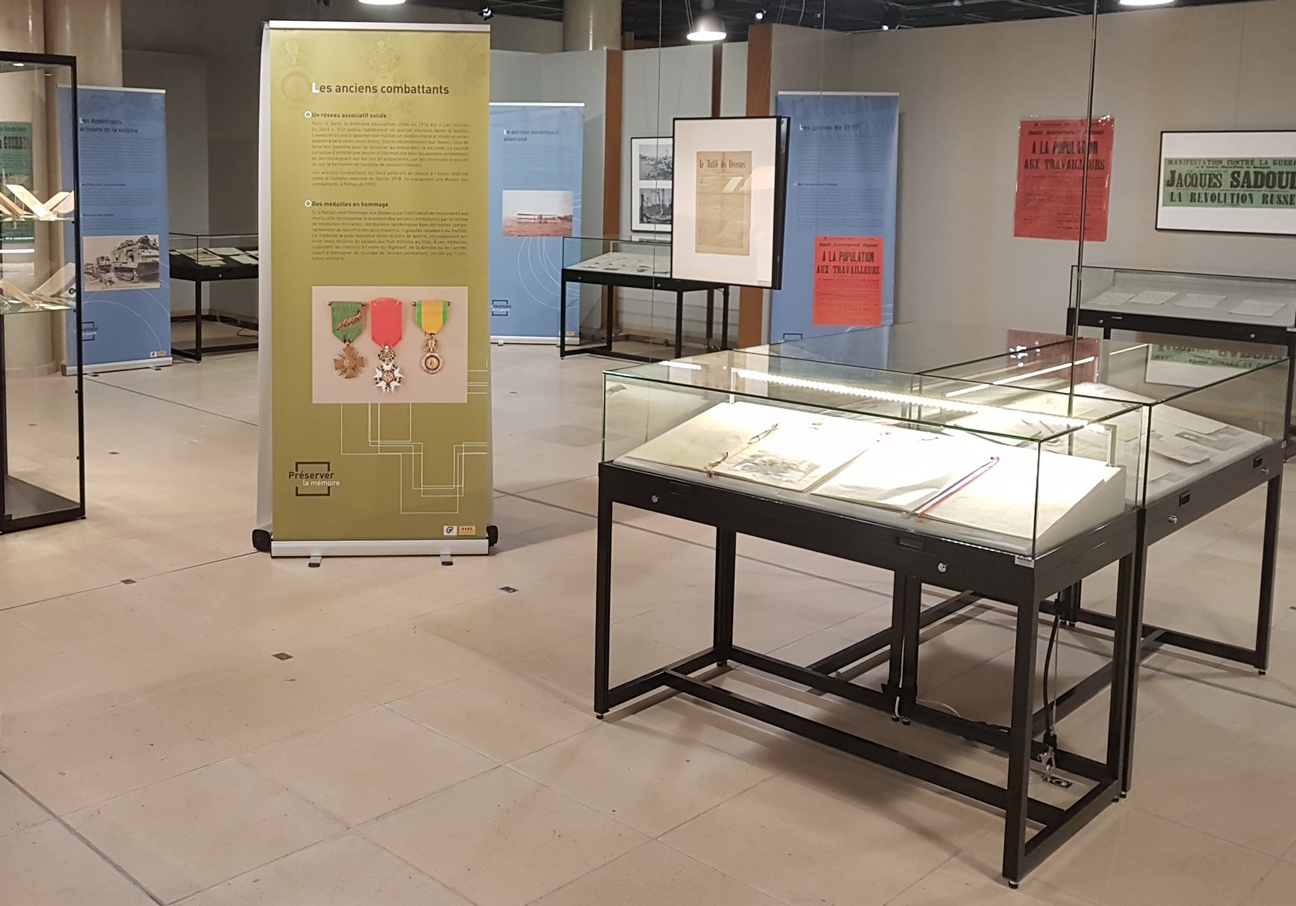 Le premier volet de l’exposition proposée de novembre 2014 à juin 2015 visait à commémorer le centenaire de l’entrée en guerre. L’occasion de mettre en lumière l’aspect humain du conflit en retraçant le parcours de différents poilus gardois lors des premières années du conflit jusqu’à l’enlisement de la bataille de Verdun en 1916. La vie à l’arrière était également dépeinte avec notamment l’implication des femmes dans l’effort de guerre et le rôle de l’école dans l’inculcation d’une culture de guerre. (Plus d'info sur cette première exposition Nos grands-parents dans la Grande Guerre - 1914 - Les moissons interrompues