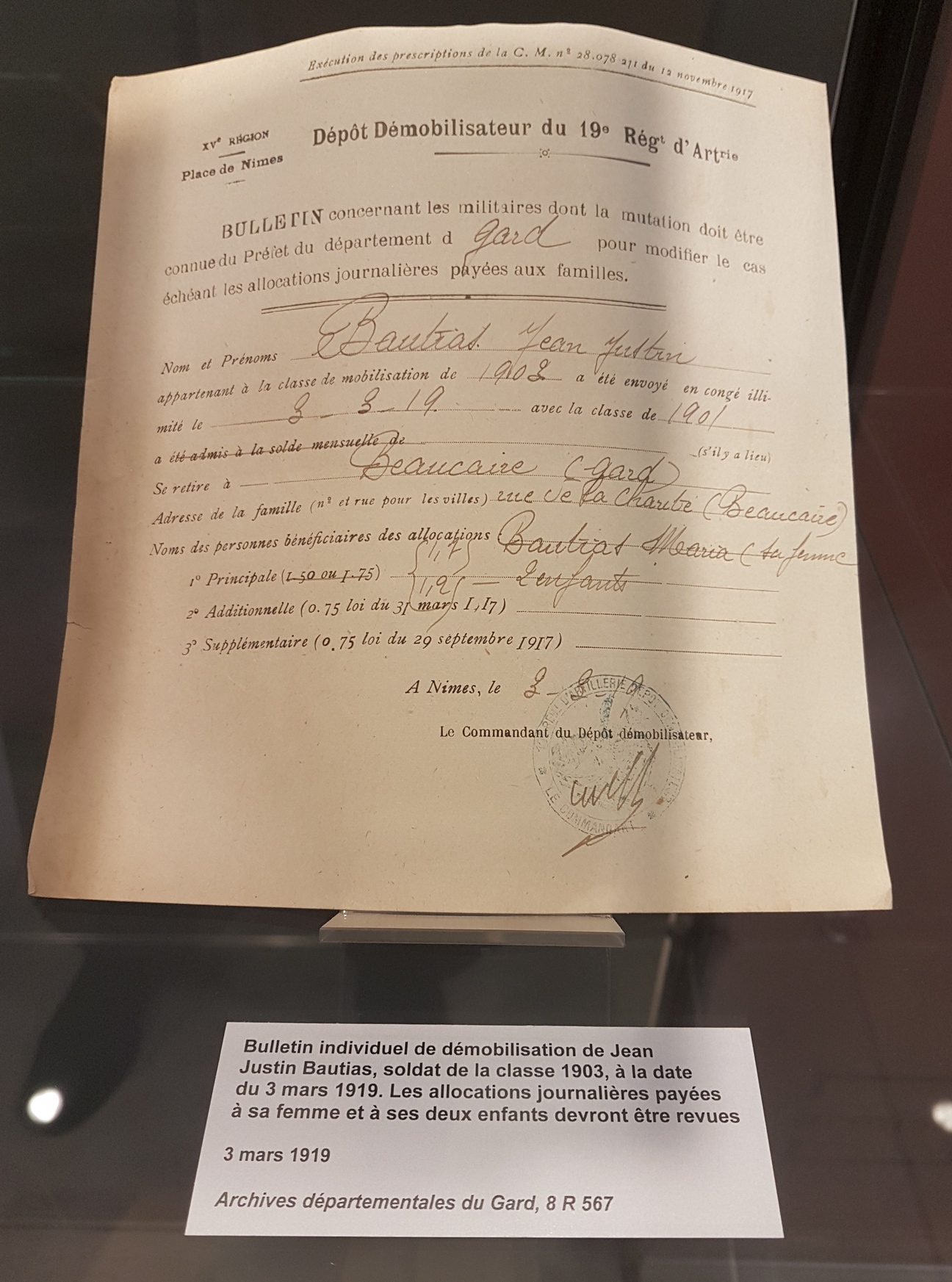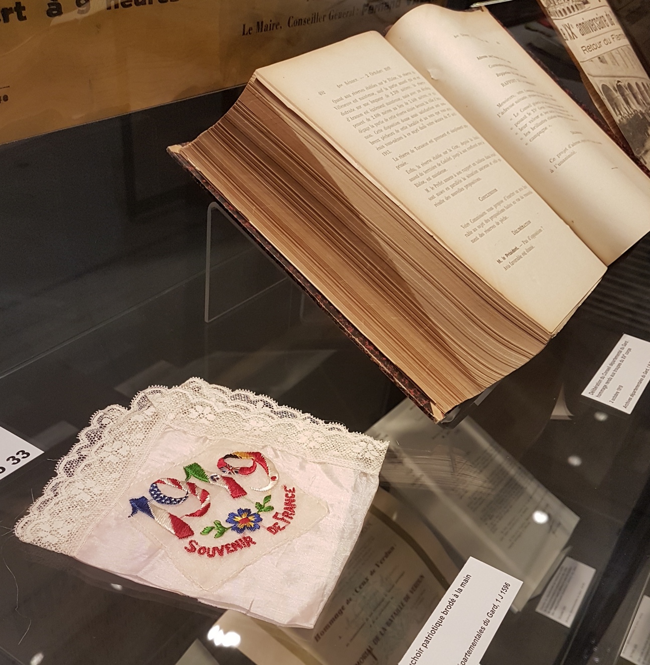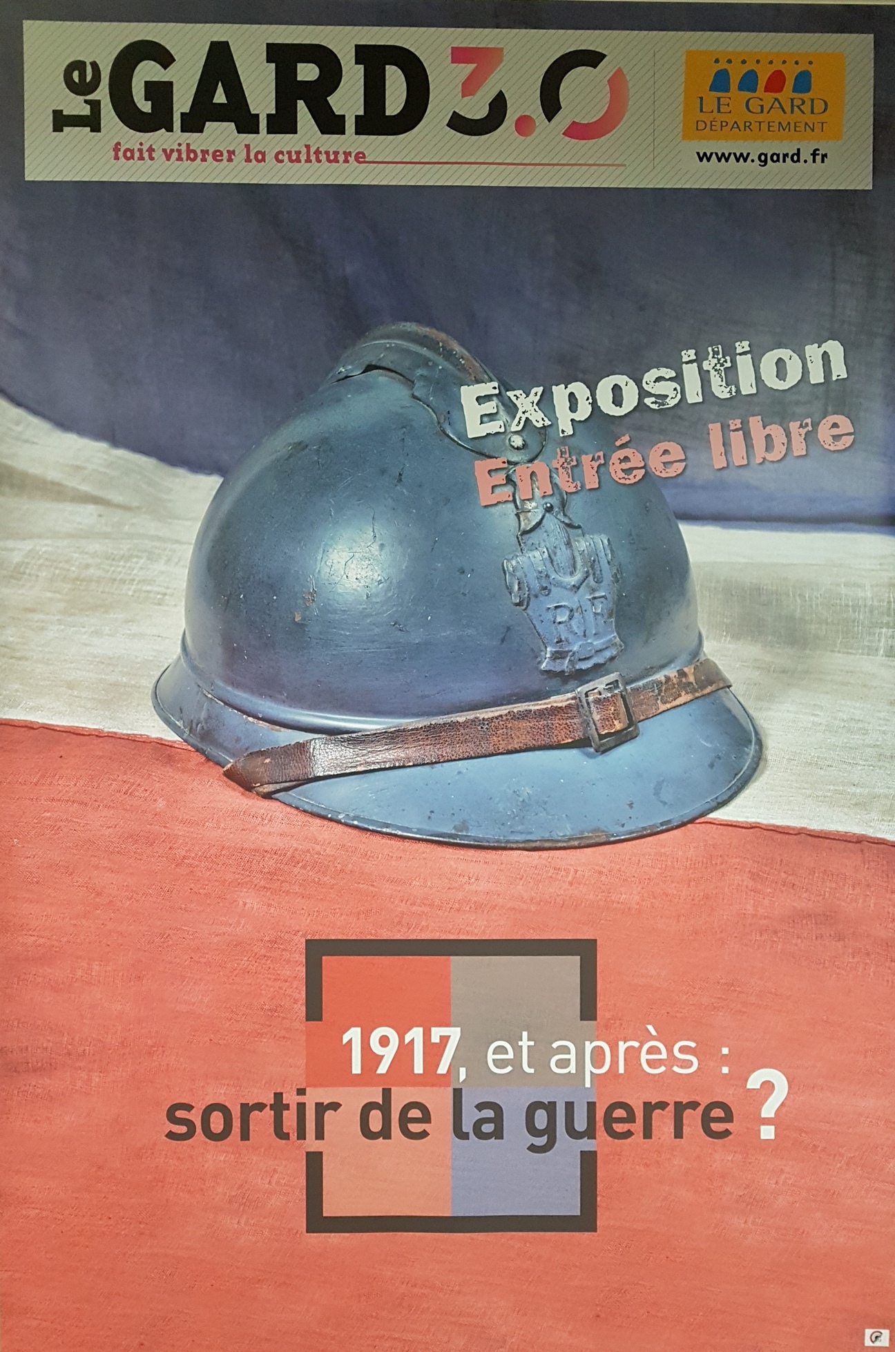 Le premier volet de l’exposition proposée de novembre 2014 à juin 2015 visait à commémorer le centenaire de l’entrée en guerre. L’occasion de mettre en lumière l’aspect humain du conflit en retraçant le parcours de différents poilus gardois lors des premières années du conflit jusqu’à l’enlisement de la bataille de Verdun en 1916. La vie à l’arrière était également dépeinte avec notamment l’implication des femmes dans l’effort de guerre et le rôle de l’école dans l’inculcation d’une culture de guerre. (Plus d'info sur cette première exposition Nos grands-parents dans la Grande Guerre - 1914 - Les moissons interrompues