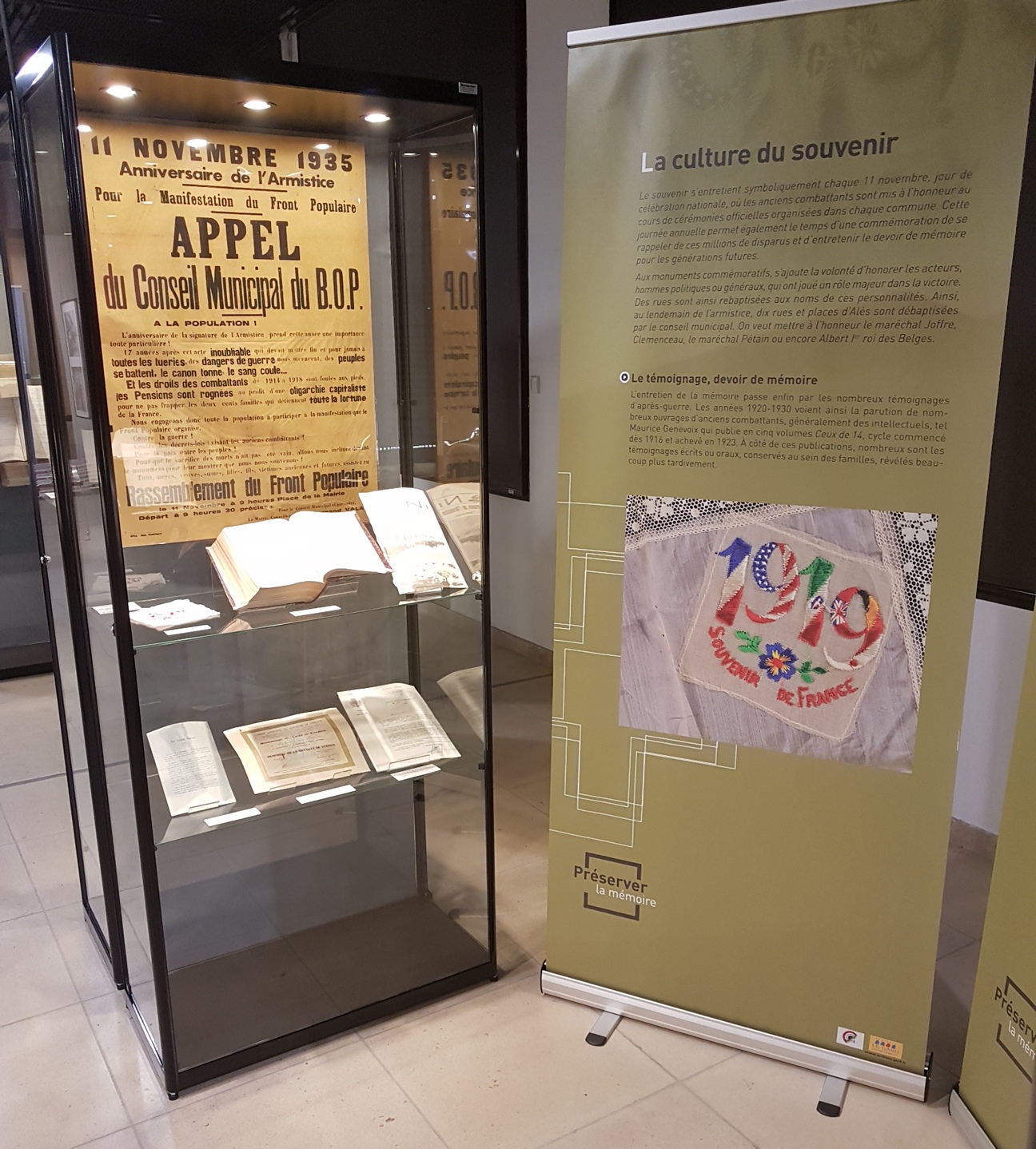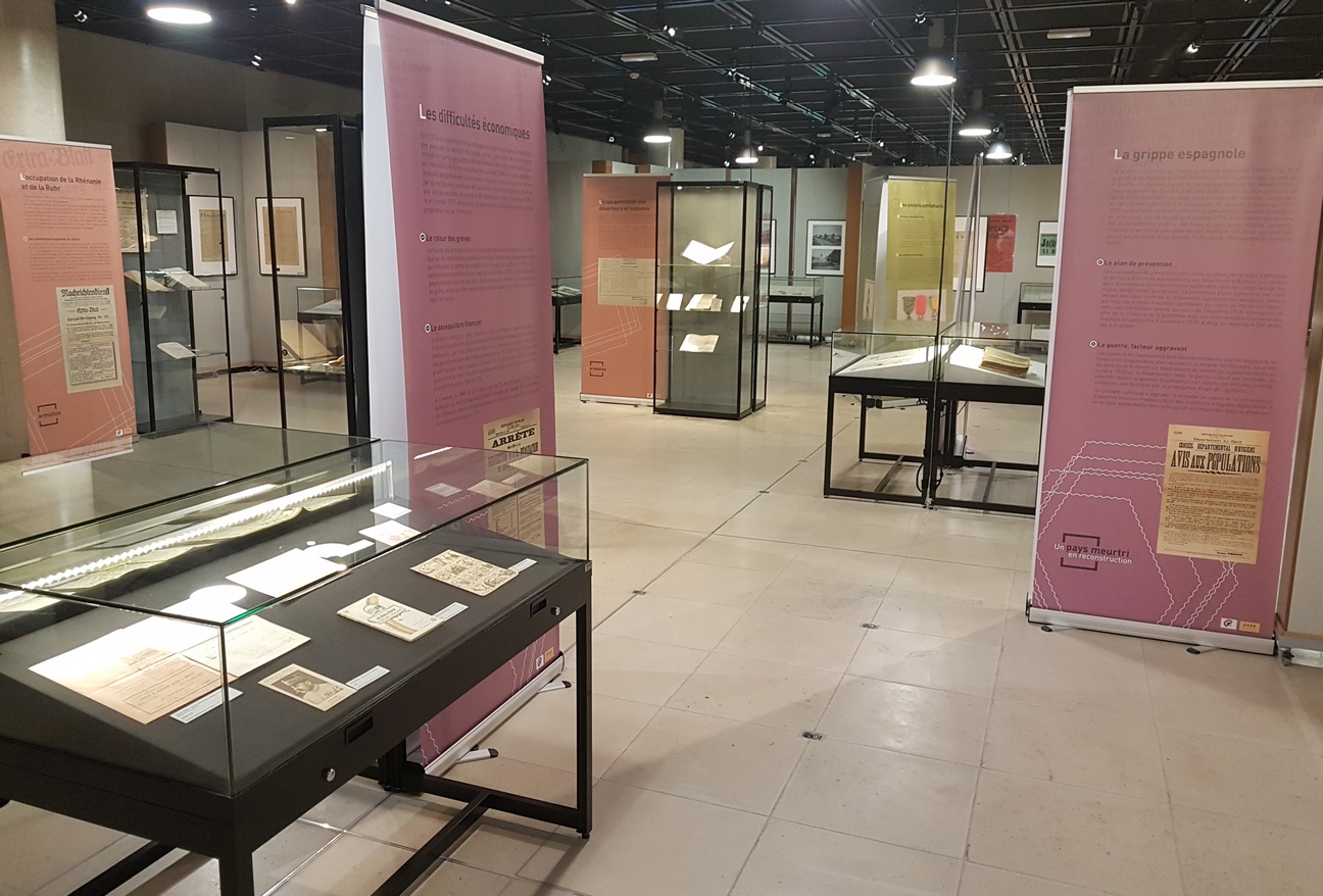 L'exposition 1917 et après : sortir de la Guerre ? présentée jusqu’en juin 2019, célébrait cette fois le centenaire de l’armistice mettant fin aux hostilités. Ce pan de notre histoire a été ainsi abordé sous différents angles soulignant tour à tour les conséquences humaines, sociales et économiques de cette fin de guerre. De l’hécatombe du Chemin des Dames de 1917 au retour des poilus, c’est tout un pays qui reste à reconstruire. Alors que les veuves et les orphelins se comptent par milliers, les associations d’anciens combattants se multiplient, apportant solidarité et soutien aux anciens poilus. Les célébrations du 11 novembre ont entretenu également une culture du souvenir en mémoire des disparus.