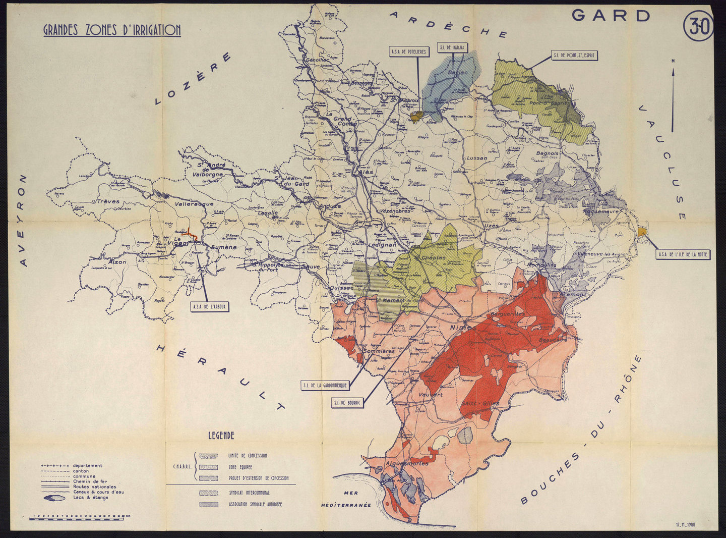 - Le Gardon, affluent du Rhône. Il prend sa source en Lozère et s’étend sur 127,3 km. Il se jette dans le Rhône à Vallabrègues. Son bassin versant qui est le plus important du département, couvre une superficie de 1671 km2.