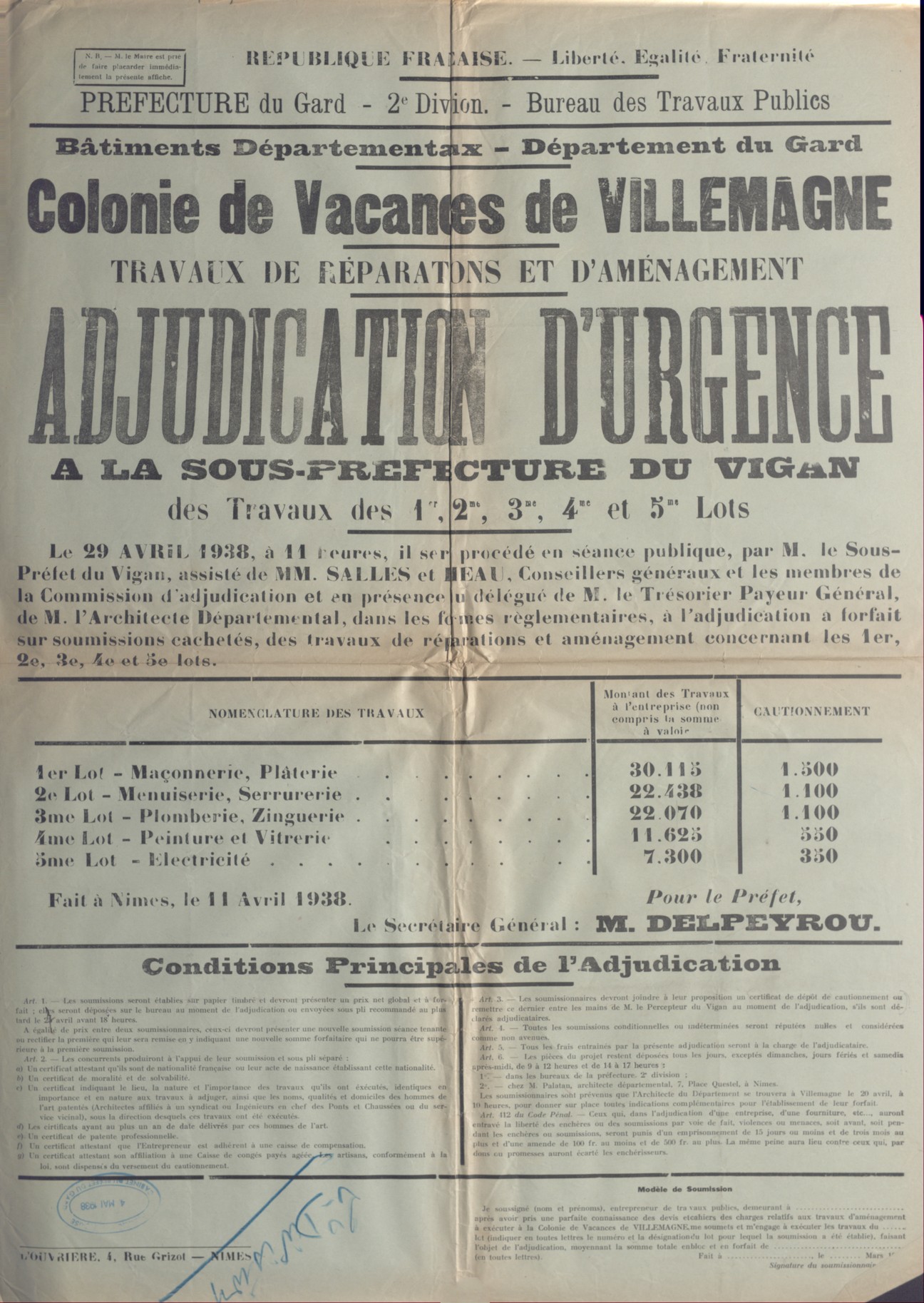 La colonie de vacances de Villemagne, située à Saint-Sauveur-Camprieu, est un service départemental, placé directement sous l’autorité du préfet. L’administration est assurée par un économe. Elle ouvre ses portes pour la première fois lors de l’été 1936. Dotée d’une capacité d’accueil de 200 enfants, âgés de 7 à 14 ans, elle fonctionne sur deux saisons de 45 jours, du 15 juin au 30 juillet et du 1er août au 15 septembre. Une saison est réservée aux garçons, l’autre aux filles. Les enfants sont admis après visite médicale. L’acheminement des colons jusqu’à la colonie est organisé par la préfecture du Gard via le réseau ferroviaire.