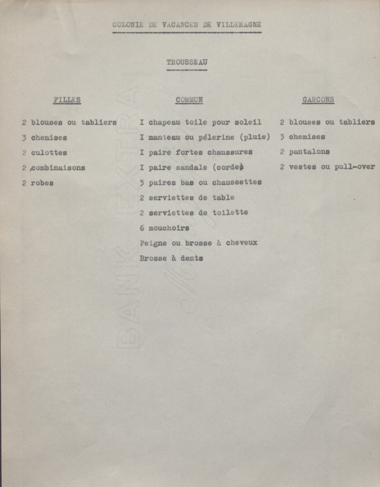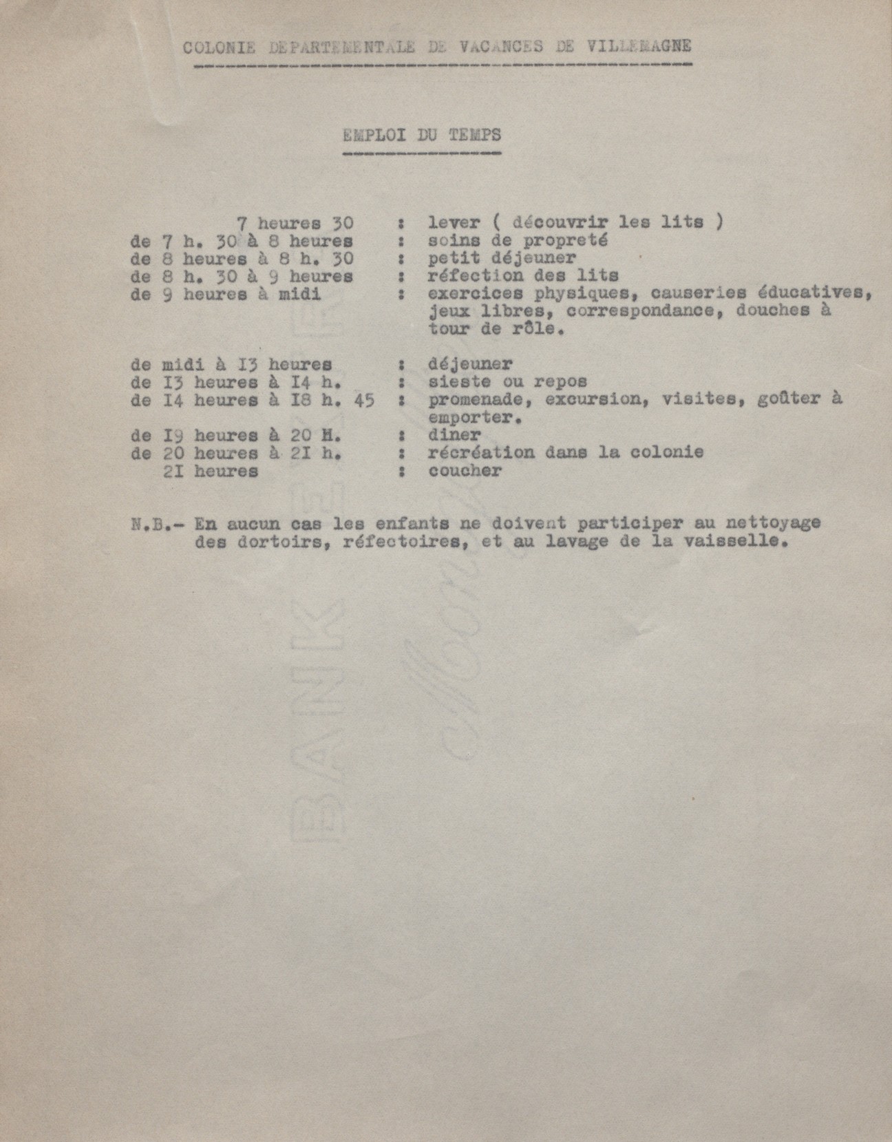 Chaque enfant doit venir muni d’un trousseau dont la liste est scrupuleusement détaillée par l’administration de la colonie selon le sexe de l’enfant. Le lever se fait à 7h30, le coucher à 21 heures. Le matin est consacré à la toilette, aux causeries éducatives, à la correspondance et aux jeux libres, l’après-midi est rythmé par les promenades et les excursions.