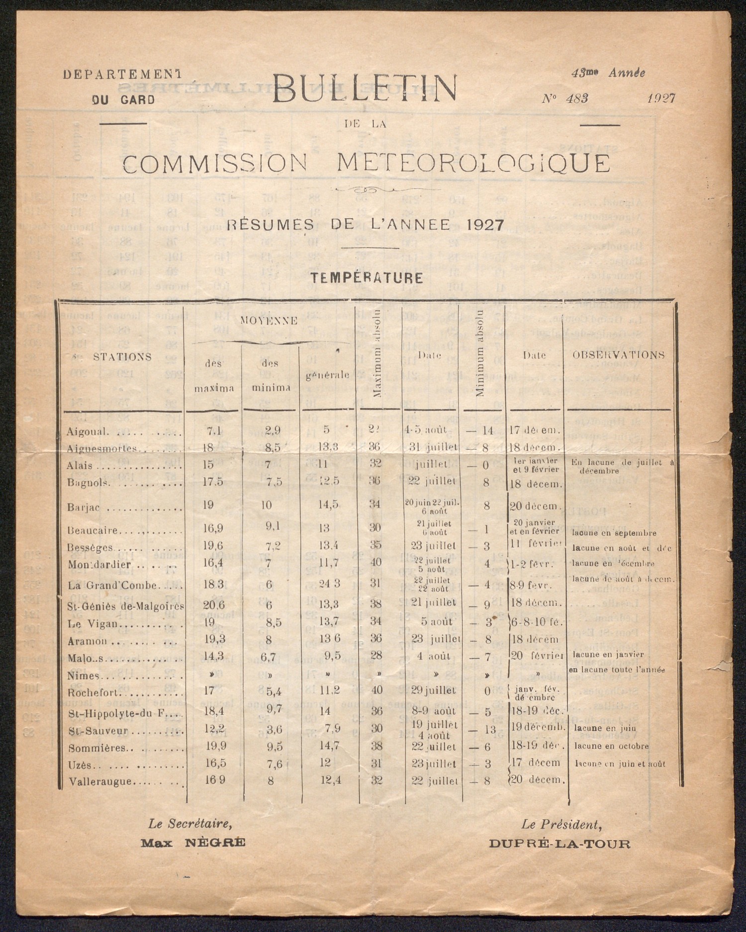 La Commission météorologique du Gard a vu le jour en 1879. Les premières observations seront faites par des bénévoles. Ils sont dix-sept, membres de la Commission ou membres correspondants. Les observations se font deux fois par jour, à neuf heures du matin et à six heures du soir. Situé au point culminant du Gard à 1567 mètres d’altitude, l’observatoire vise à faire des prévisions climatiques en tentant d’estimer au plus juste le temps sur une période donnée à partir de l’étude du système climatique.