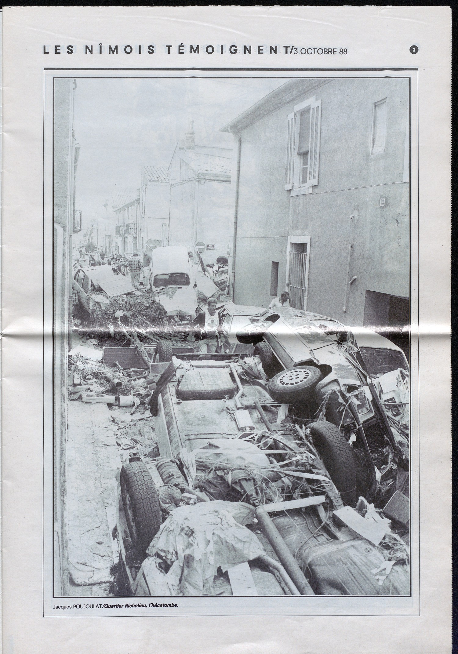 Nîmes a également été frappée par un épisode cévenol meurtrier le 3 octobre 1988. Neuf personnes trouvent la mort, deux pilotes d'hélicoptère sont tués, 45 000 personnes sinistrées, pour l’équivalent de 610 millions d’euros de dégâts. Les rues de la ville sont balayées par les flots qui emportent tout sur leur passage lors d’une succession d’orages échelonnés sur une dizaine d’heures.