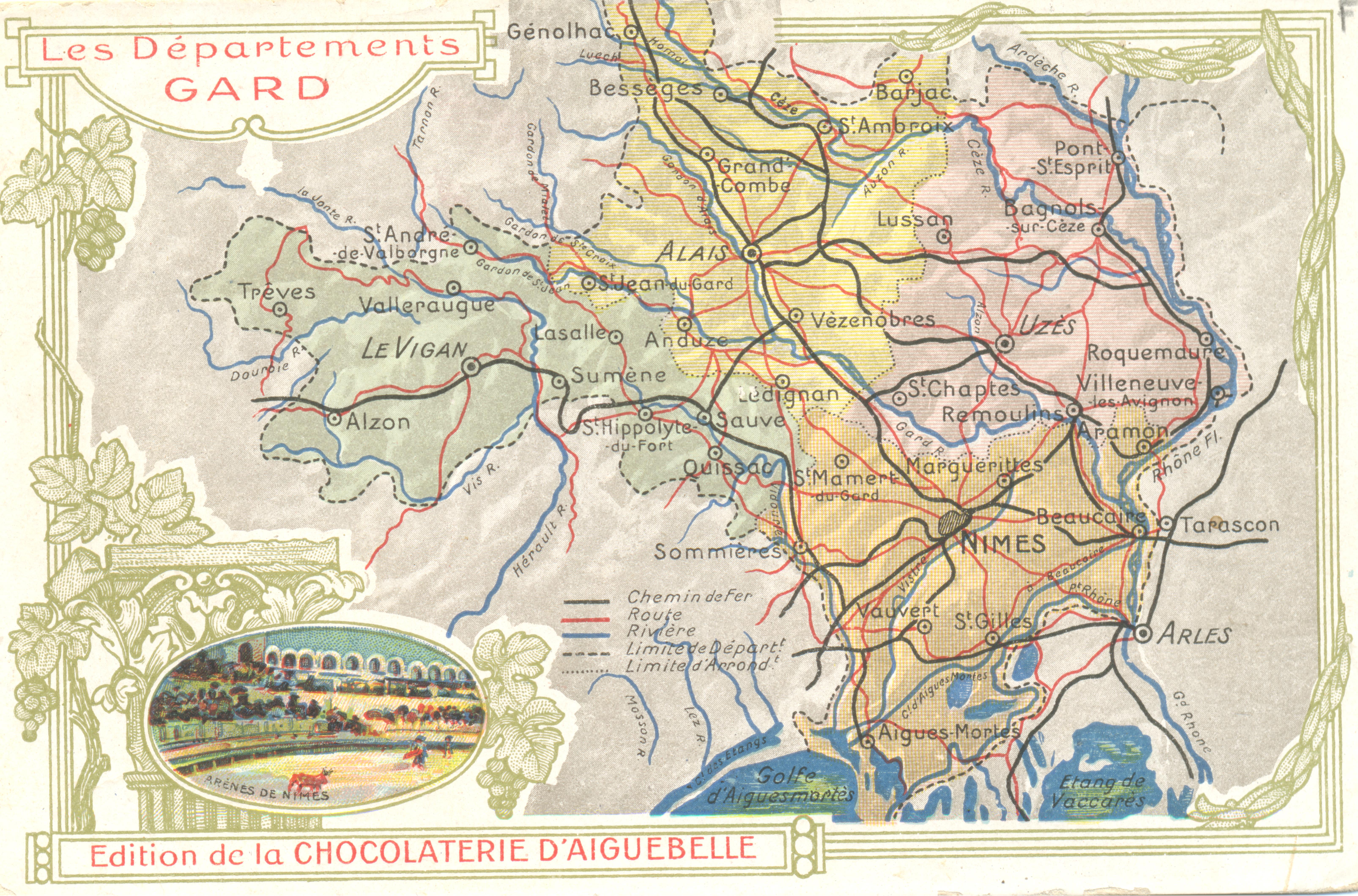La délimitation du Département du Gard se fera à partir des anciens diocèses civils de Nîmes, Alès et Uzès. Le département était alors divisé en 8 districts : Alès, Beaucaire, Nîmes, Pont-Saint-Esprit, Saint-Hippolyte, Sommières, Uzès et Le Vigan. Ces 8 circonscriptions qui furent supprimées lors de la réforme administrative du 28 pluviôse an VIII (17 février 1800) divisent à cette époque de manière équilibrée le territoire du Département du Gard tout en correspondant chacune à des régions ou pays encore bien identifiés encore aujourd’hui.