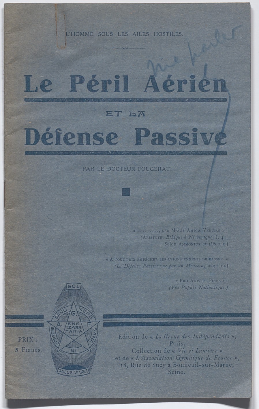 Une autre brochure réalisée par un médecin (1 M 881) explique le péril aérien et le rôle de la défense passive qu’il définit comme "l’art de protéger la vie humaine des atteintes de l’ennemi". Il regroupe le danger aérien en cinq catégories :