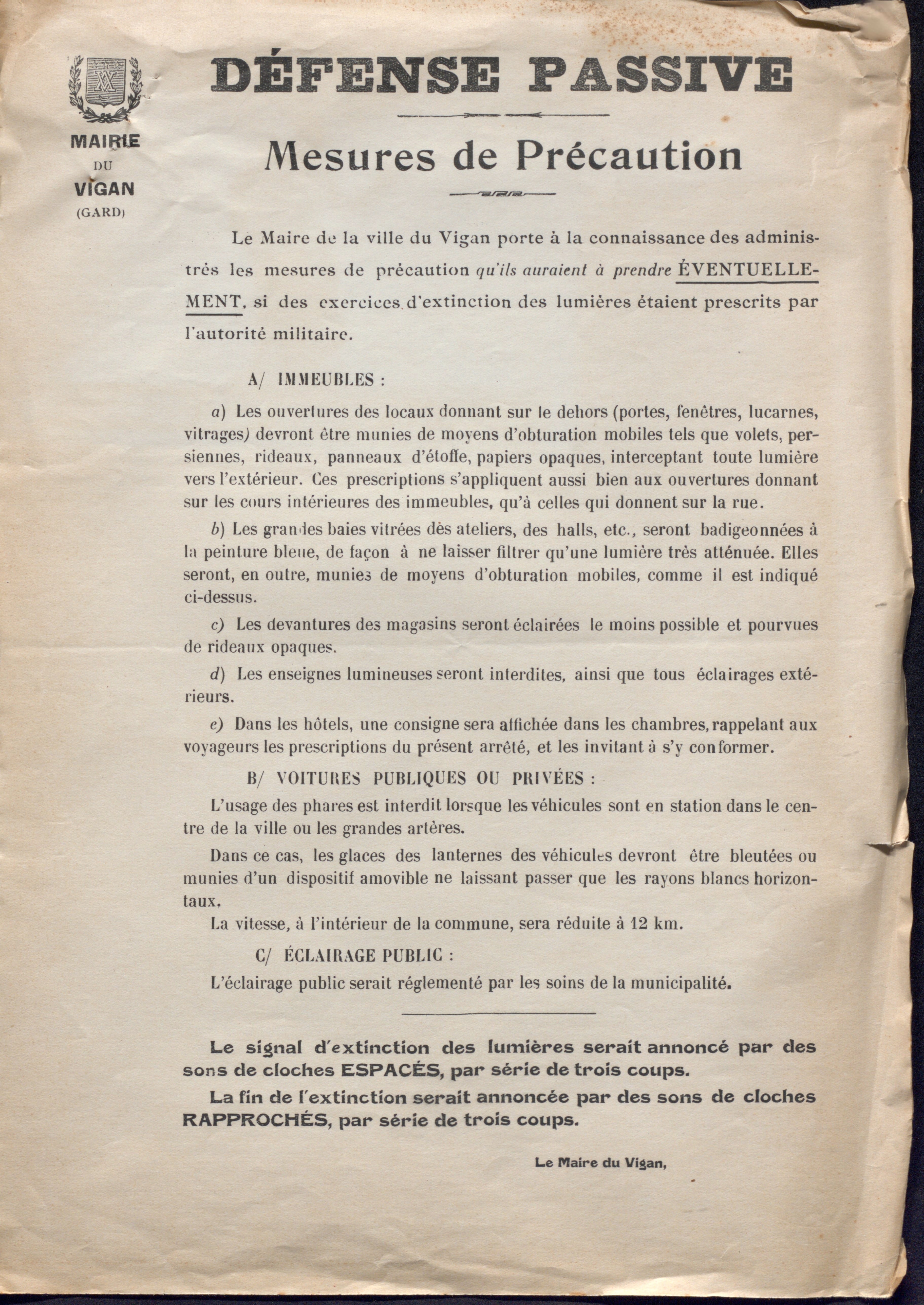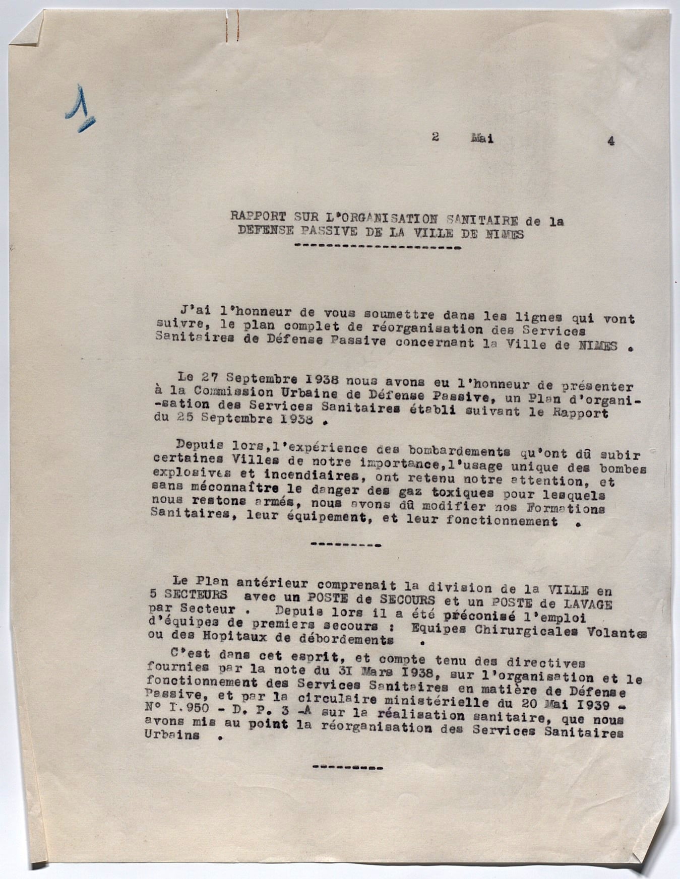 La ville de Nîmes, qui disposait d’un premier plan de défense passive bien avant 1938, présente un nouveau rapport à la commission urbaine de défense passive le 27 septembre 1938, soit un an avant le déclenchement des hostilités.