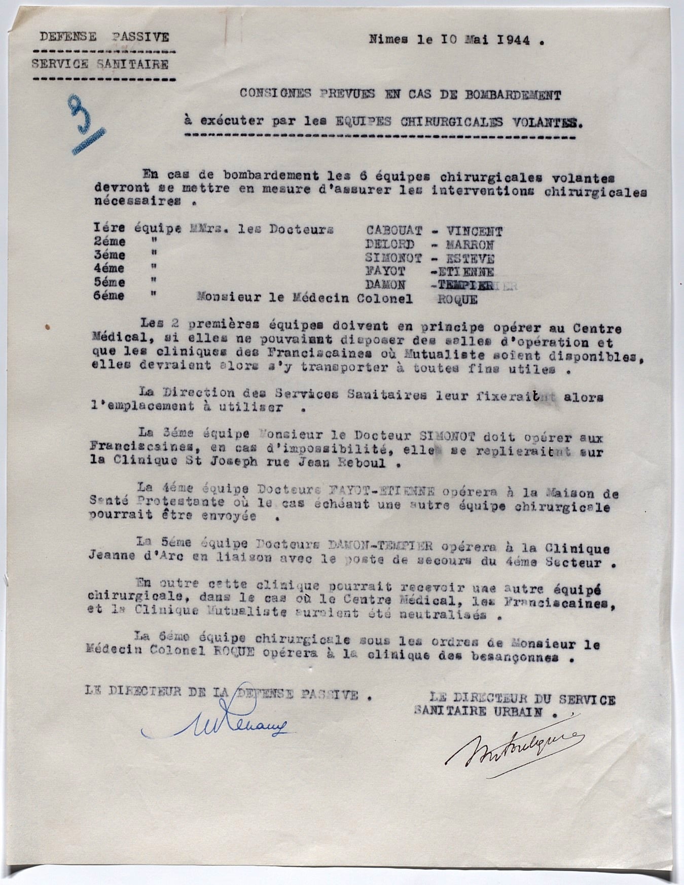 Nous conservons l’intégralité de ce rapport dans l’article 5 M 71. Le poste de commandement de la défense passive se situe aux arènes sous la direction d’un médecin, chef des services sanitaires de la défense passive. En cas de bombardement, plusieurs équipes d’intervention sont en capacité d’agir comme suit :
