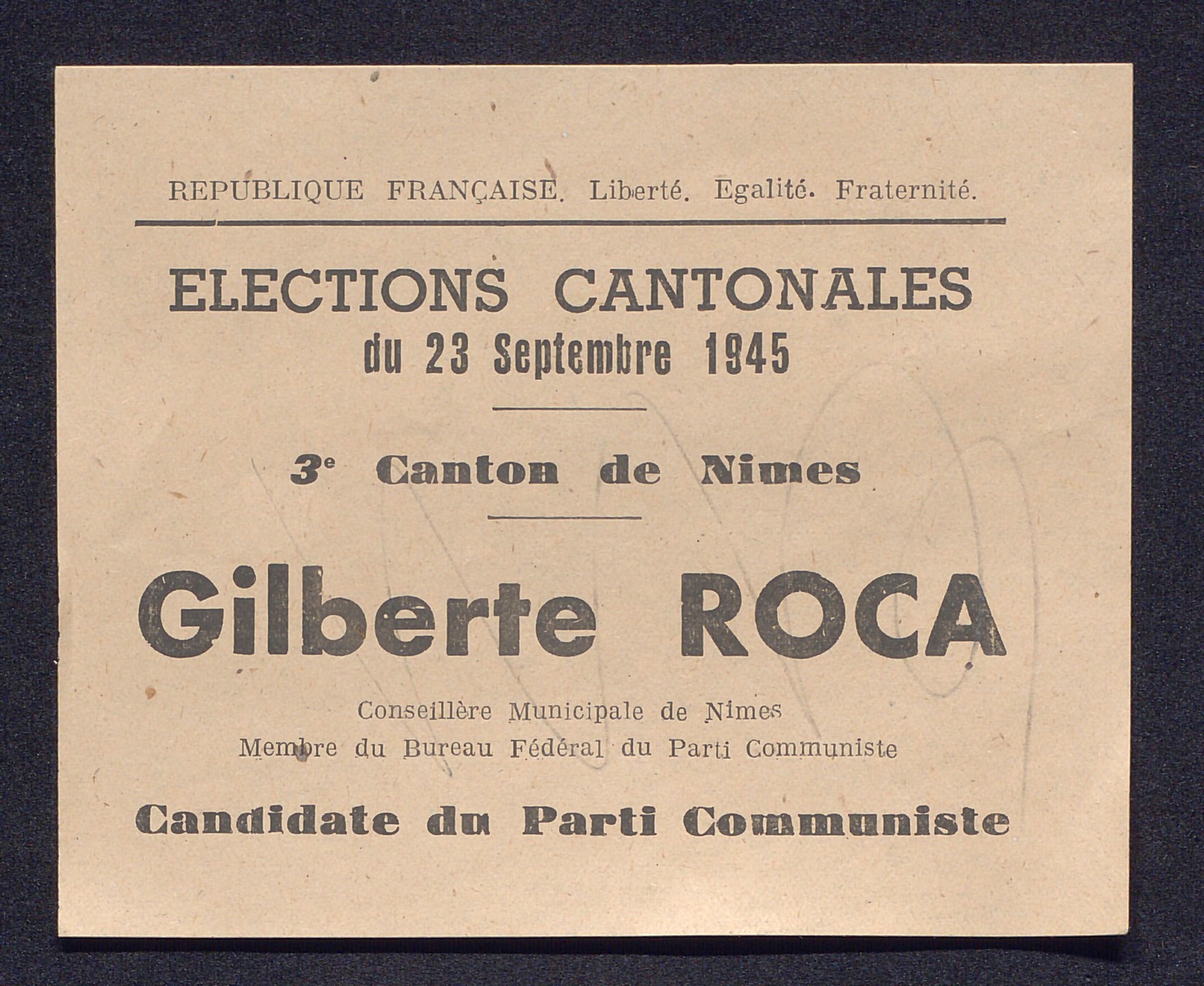 Née en 1911, Gilberte Roca sera la première femme à siéger au conseil général après les cantonales du 30 septembre 1945. Déjà conseillère municipale de Nîmes aux côtés de Léon Vergnole depuis le mois d’avril de la même année, elle a derrière elle une activité politique importante. Militante communiste et résistante dans l’Aude, à Lyon et dans le Gard pendant la guerre, elle fait également partie des premières femmes députées.