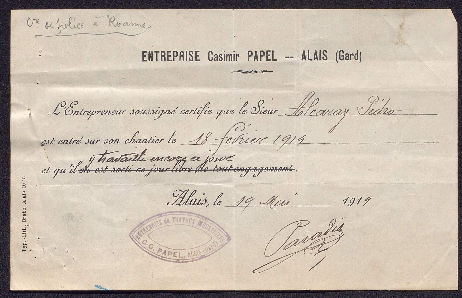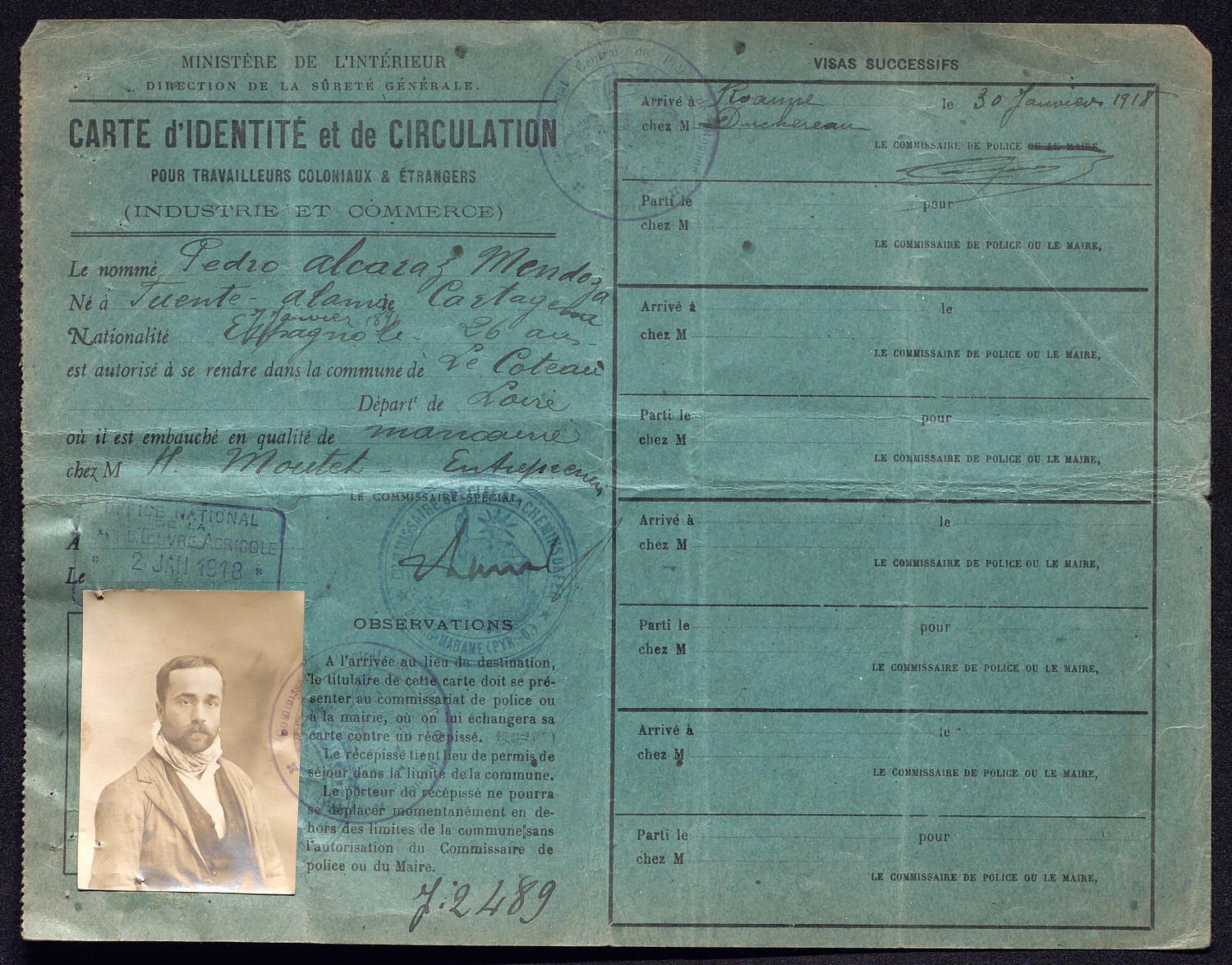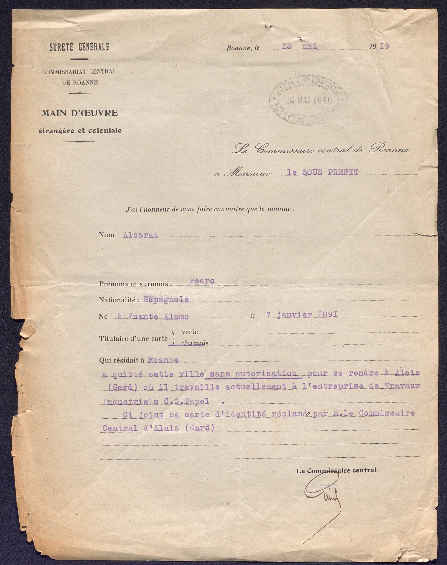 Le contrôle des étrangers connaît un tournant majeur à la fin de la Première Guerre mondiale. Un décret d’avril 1917, instaure en effet la « carte d’identité d’étranger » afin de recenser, surveiller et enregistrer les résidents non français. La création de ce document administratif témoigne alors de la détermination à exercer un contrôle accru sur la main d’œuvre étrangère. Mais en ces temps de fin de guerre, cette carte vise aussi à limiter les risques d’espionnage ennemis.