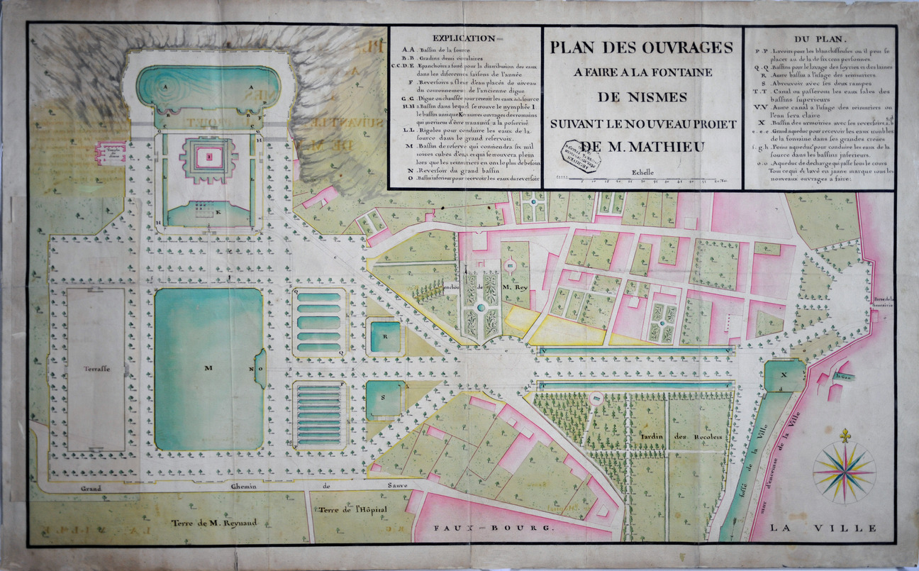 La source de la Fontaine contribua à fixer les premiers habitants de Nîmes et fut dès l’origine un lieu sacré. Les Romains accomplirent de gros travaux pour l’aménager. Tombé en ruine, cet ensemble laissé hors des murs de la ville médiévale n’a été redécouvert qu’à partir de 1738. La ville décide de remettre en état la source antique afin de pallier le problème d’approvisionnement en eau dû aux sécheresses. C’est lors de ces travaux que le système de canalisations et de retenues d’eau est découvert. Les travaux d’abord planifiés par Clapiès, ingénieur de la province de Languedoc, sont continués par son successeur Jacques-Philippe Maréchal. L’objectif est de mettre en scène la source et les vestiges antiques découverts, dans une composition inspirée des jardins à la française, avec ses allées symétriques, ses alignements d’arbres, l’ensemble enrichi de balustres, vases et bancs.