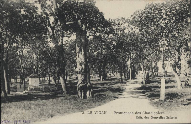 Le parc des Châtaigniers est situé sur la commune du Vigan. Les remparts du Moyen Âge entouraient ce qui constitue aujourd’hui la vieille ville : la promenade des Châtaigniers, le Plan d’Auvergne, la rue du Chef-Marceau et le jardin de la Caisse d’Épargne marquent l’emplacement des anciens fossés. Après la destruction des remparts au XVIIe siècle, le bois de châtaigniers dont les beaux arbres étaient déjà centenaires fut transformé en promenade publique. Cette promenade était considérée comme "le plus bel ornement de la ville".