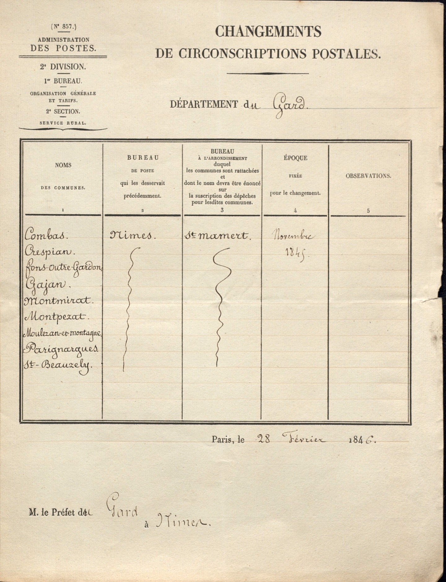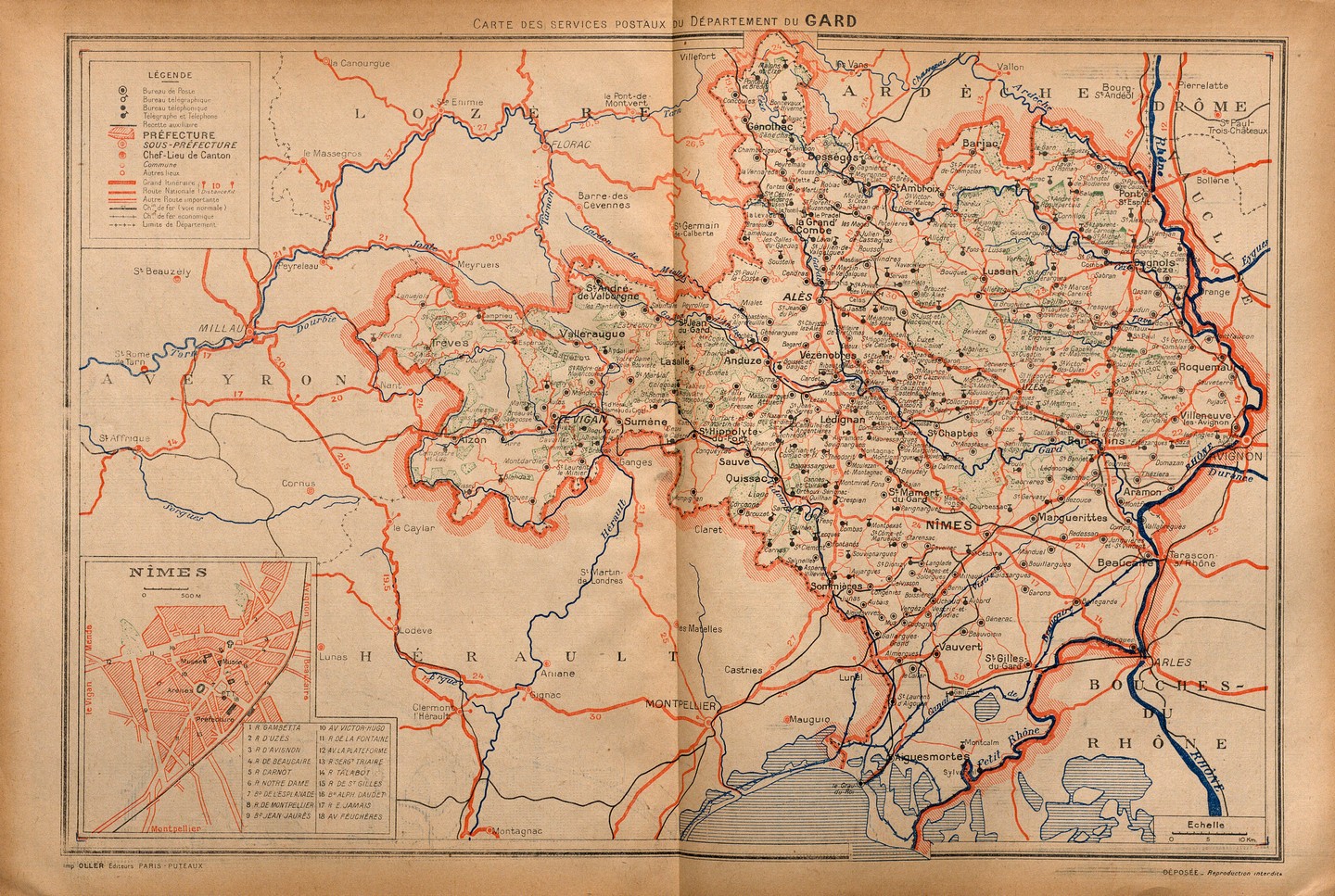 - 1791 : le département du Gard compte 22 bureaux de poste en 1791 répartis sur huit districts, Nîmes, Alès, Beaucaire, Sommières, Pont-Saint-Esprit, Saint-Hippolyte-du-Fort, Uzès, Le Vigan.