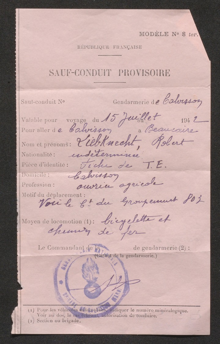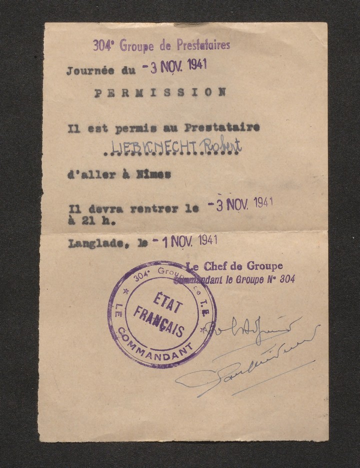Robert Liebknecht est ensuite employé au début de l’automne 1940 comme ouvrier agricole sur la commune de Calvisson.