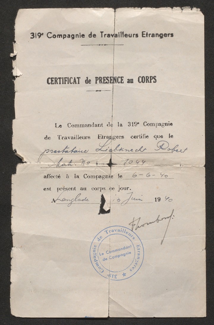 Il est d’abord incorporé le 6 juin 1940 dans la 803e Compagnie de Travailleurs étrangers, non comme soldat car relevant d’un pays belligérant mais comme prestataire dans la lutte économique. Des documents témoignent ensuite de la "Présence au corps" de Robert Liebknecht dans la 319e Cie le 13 juin 1940 puis dans la 304e le 26 septembre 1940.