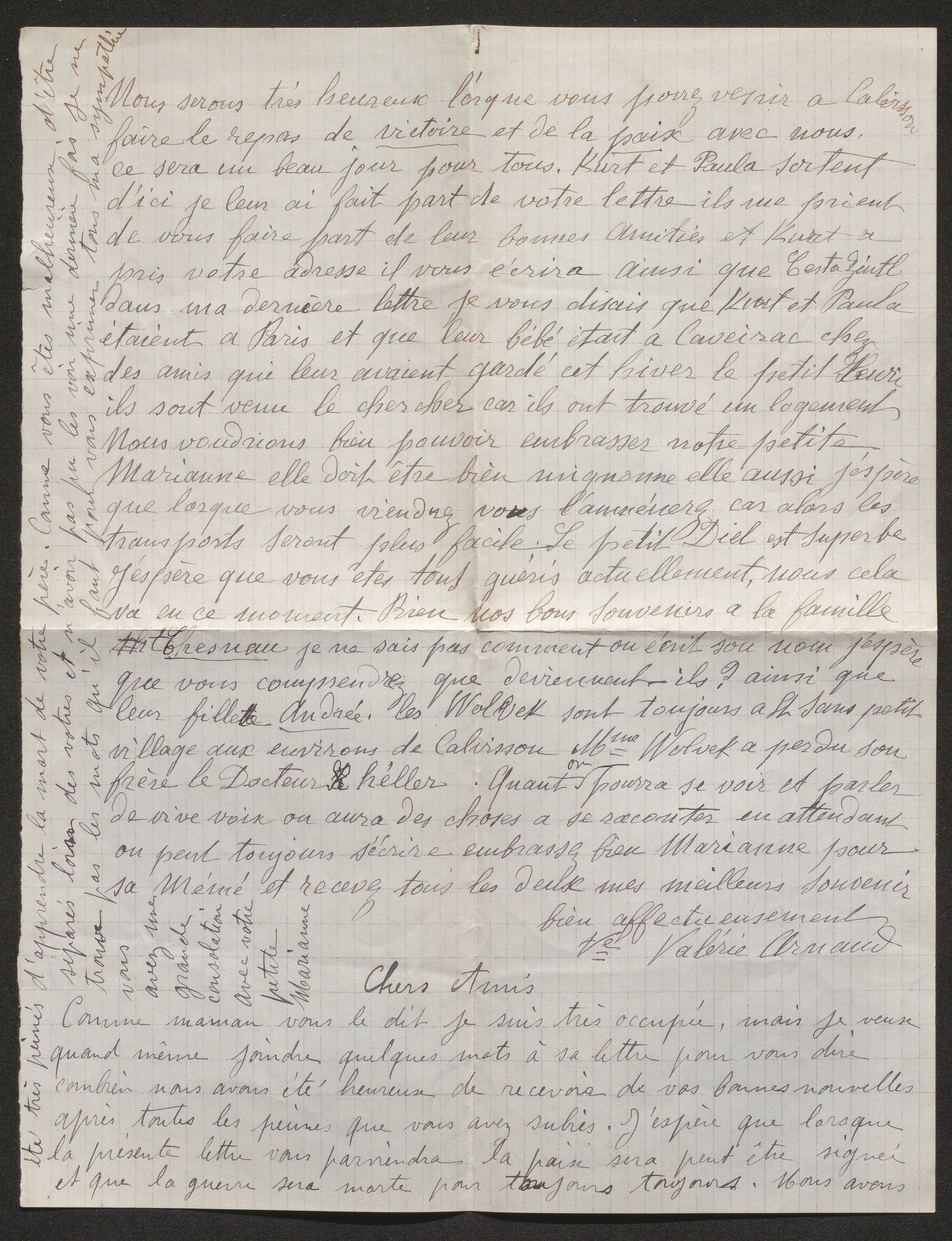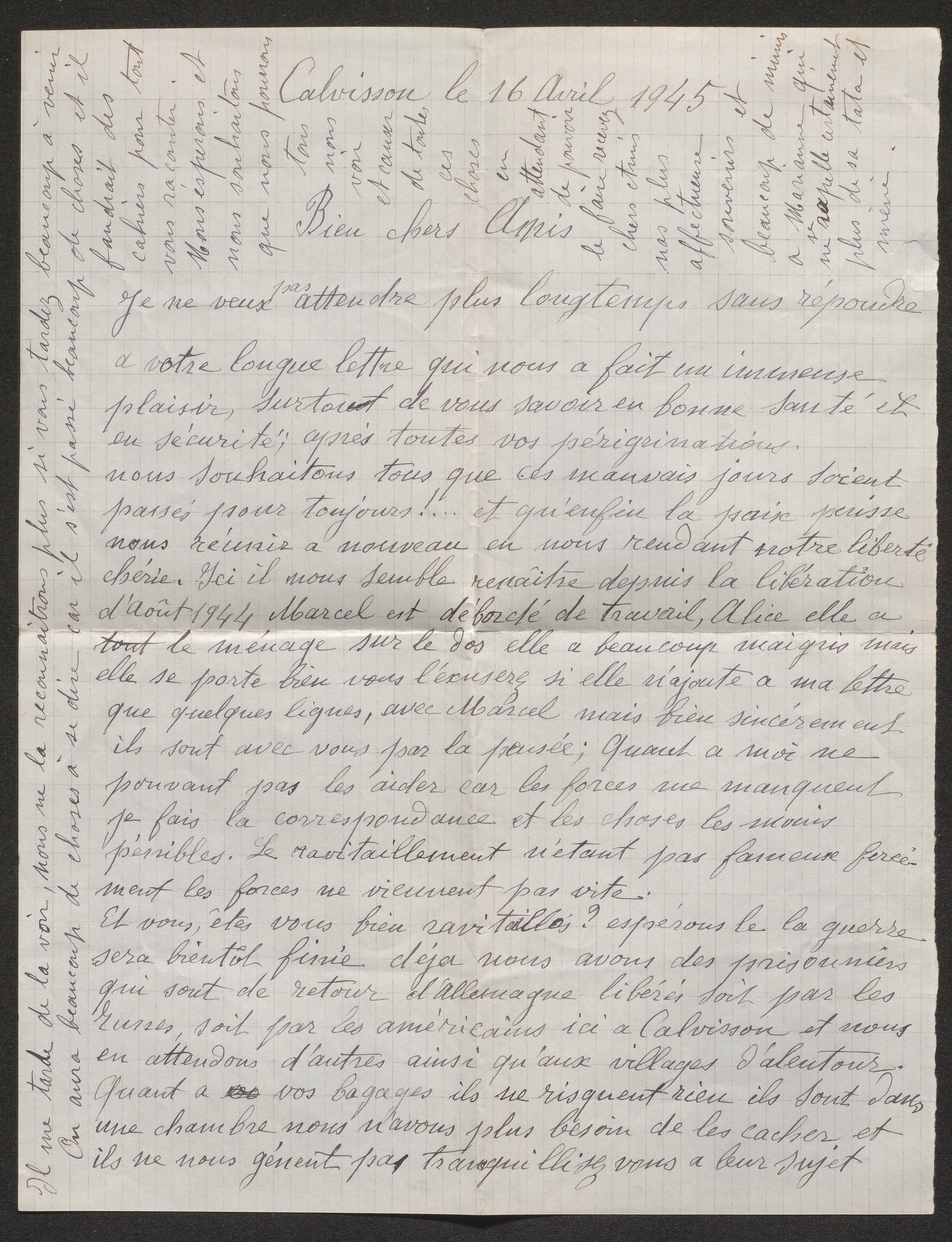 Ici, il nous semble renaître depuis la libération d’août 1944 […] Nous serons très heureux lorsque vous pourrez venir à Calvisson faire le repas de la victoire et de la paix avec nous. Ce sera un beau jour pour tous.